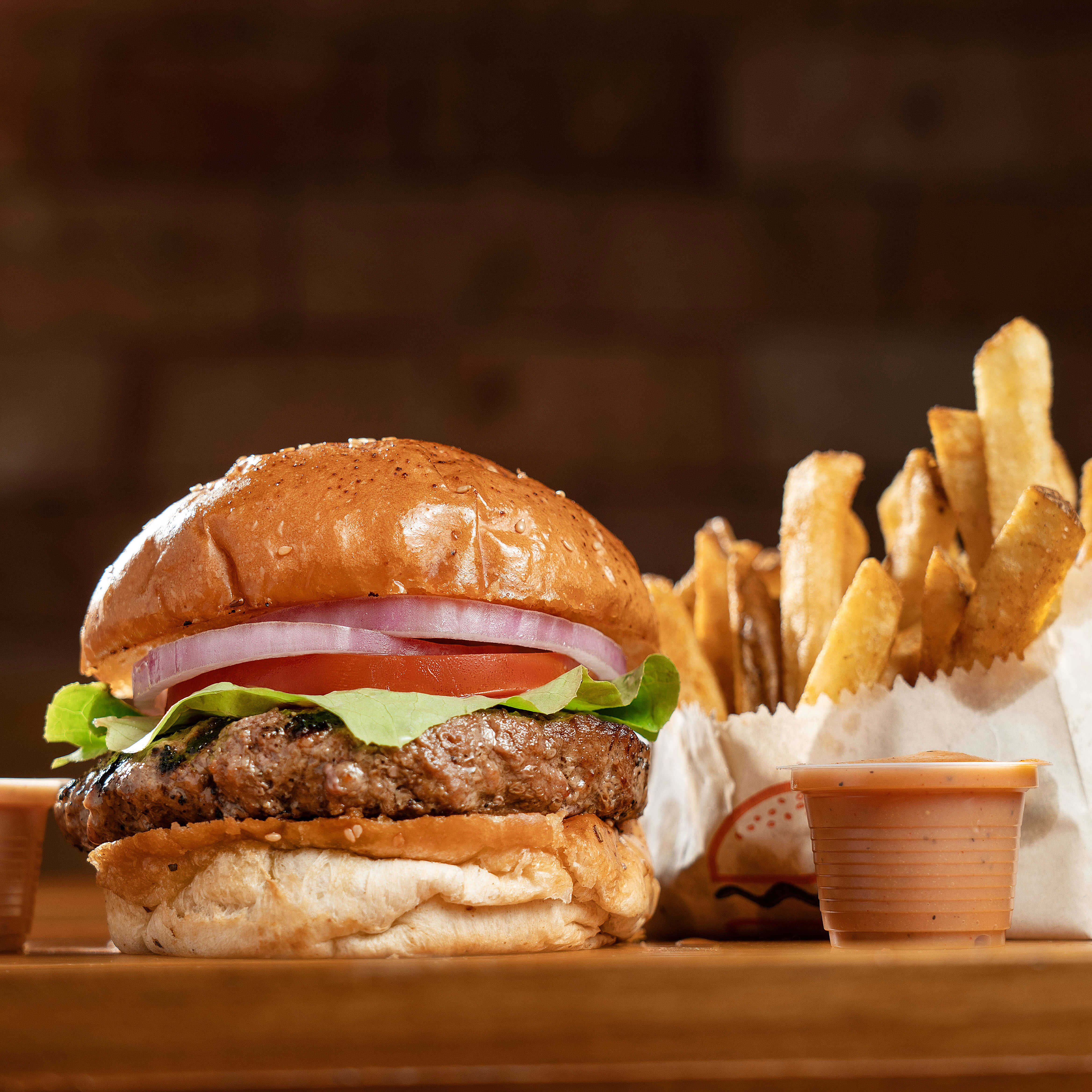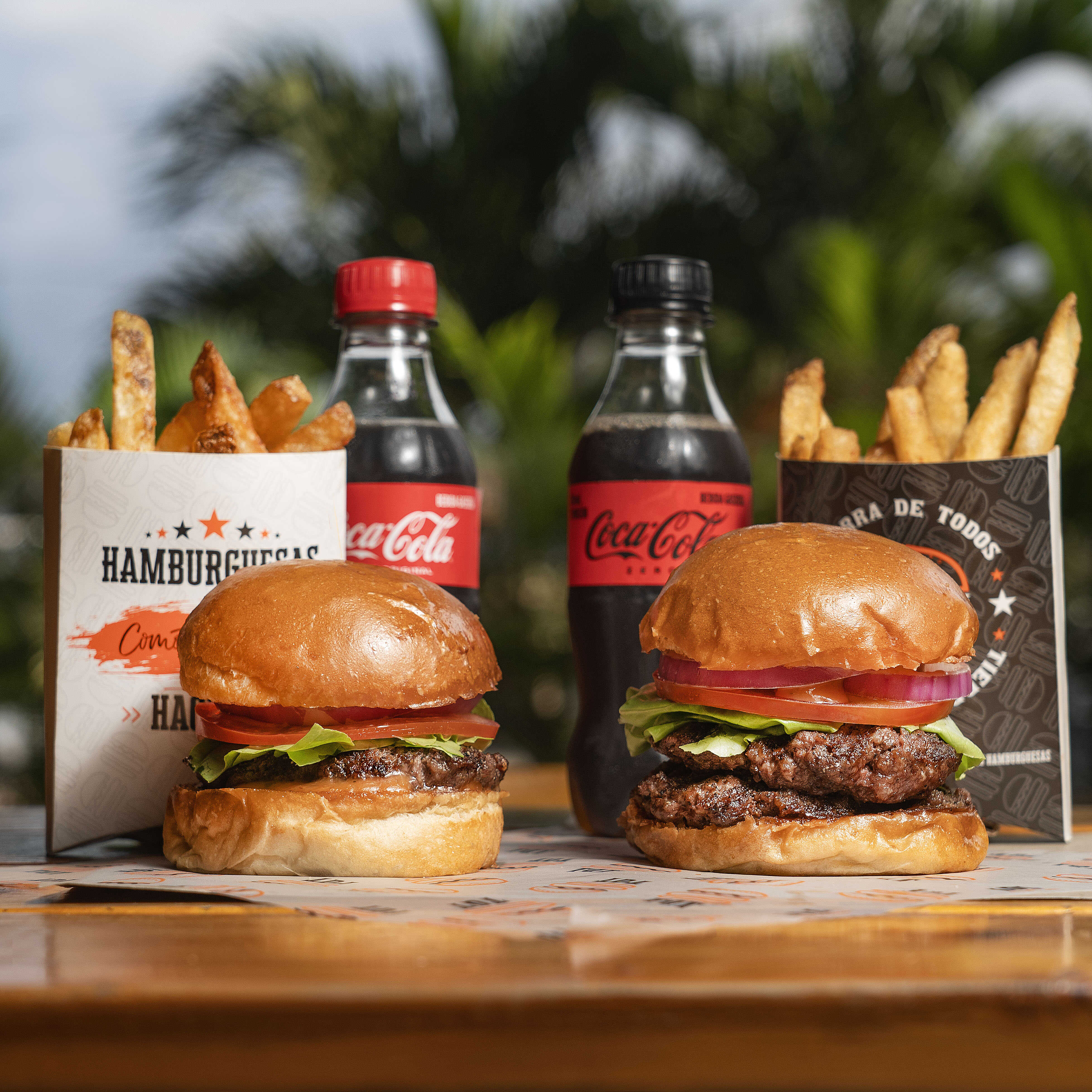 Hamburguesa de 100 g de carne 100 % angus certificada, con lechuga, tomate, cebolla, 147gr de papas y Coca- Cola 250 ml.