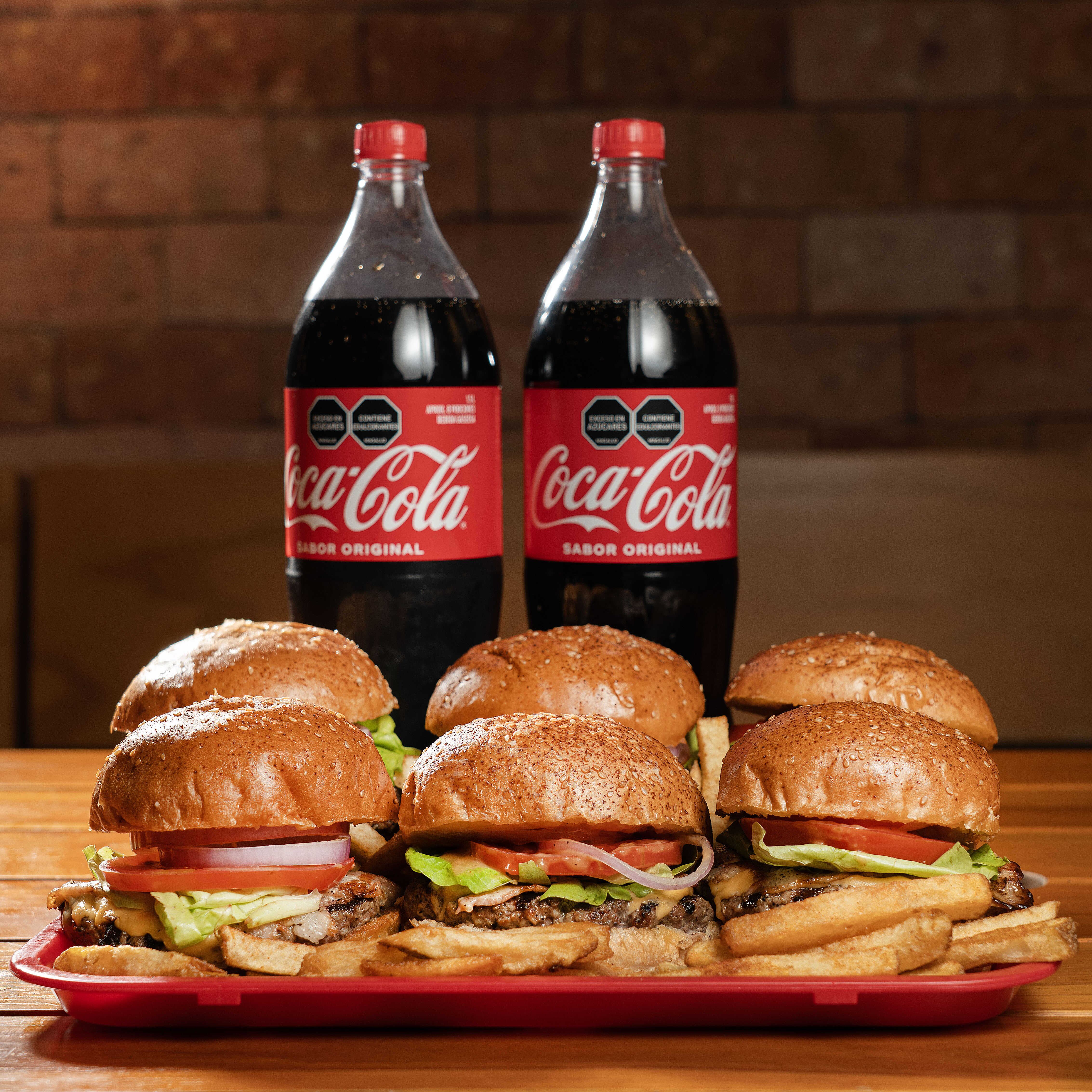 Hamburguesa de 100 g de carne 100 % angus certificada, con lechuga, tomate, cebolla, adición de queso americano y Coca- Cola 250 ml.