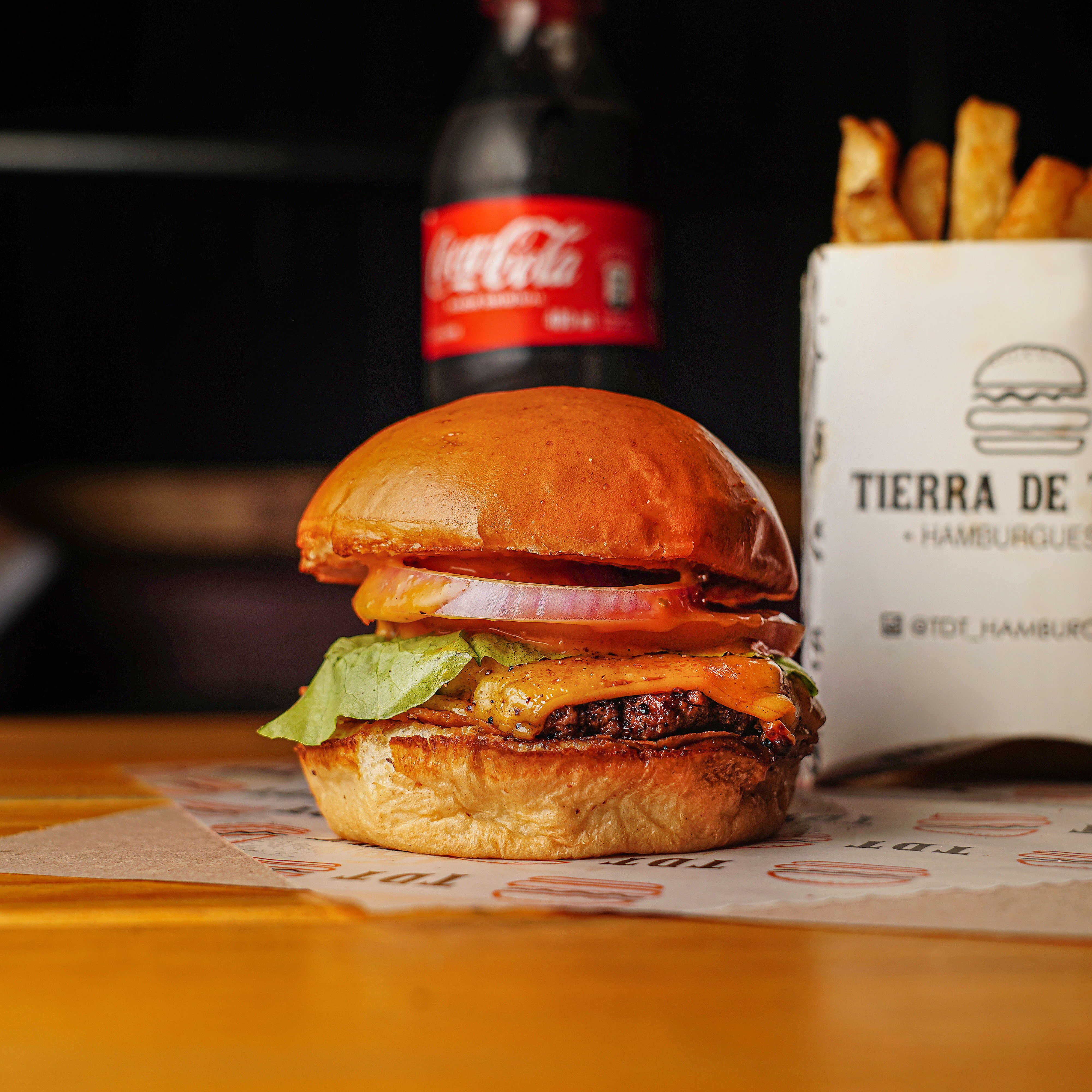 Hamburguesa de 200 g de carne 100 % angus certificada, con lechuga, tomate, cebolla, papas TDT y salsa de la casa (receta secreta) Papas TDT..