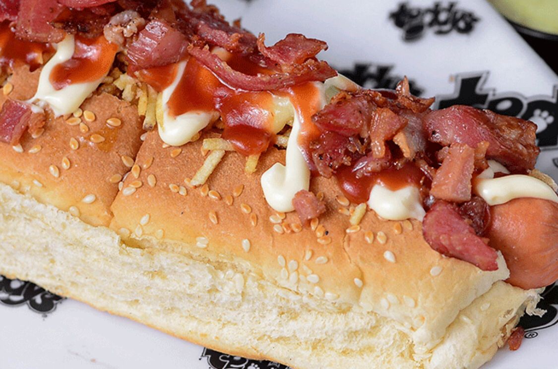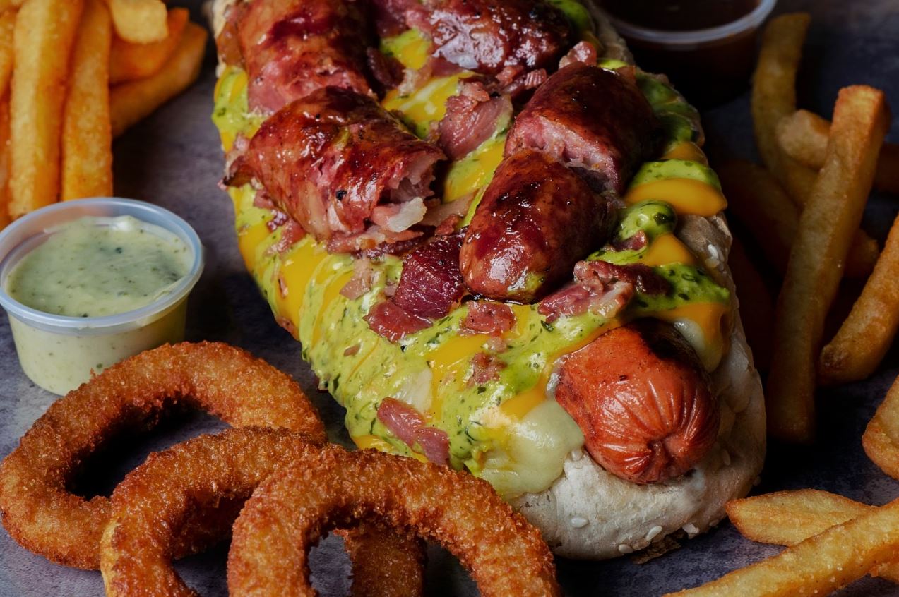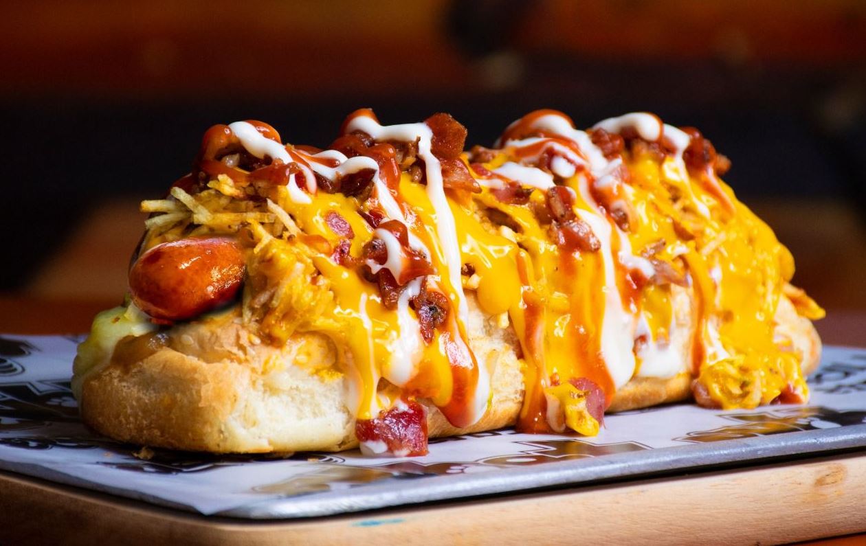 Salchicha premium americana, doble queso mozzarella, tocineta, salsa de queso cheddar y cebolla caramelizada.