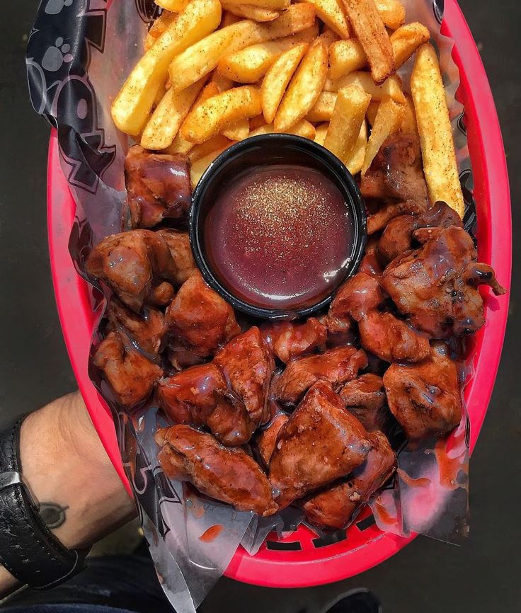 Formula de la casa sin hueso 150 g de suave carne bañada en salsa BBQ y acompañante (papas o yucas).