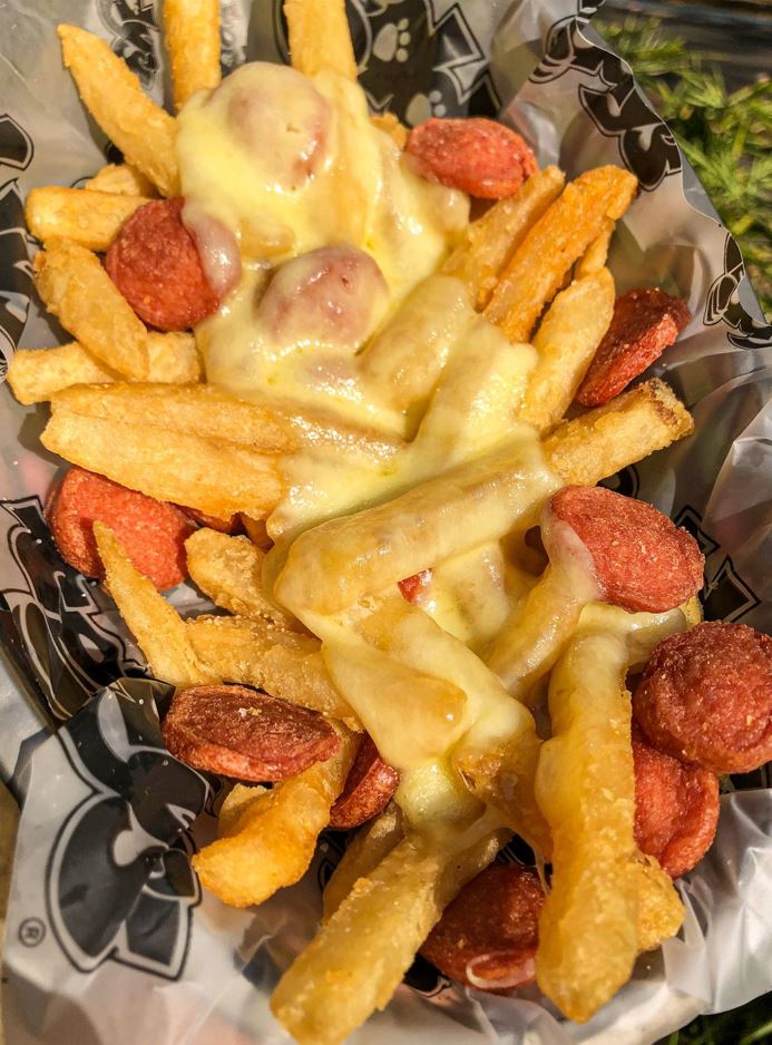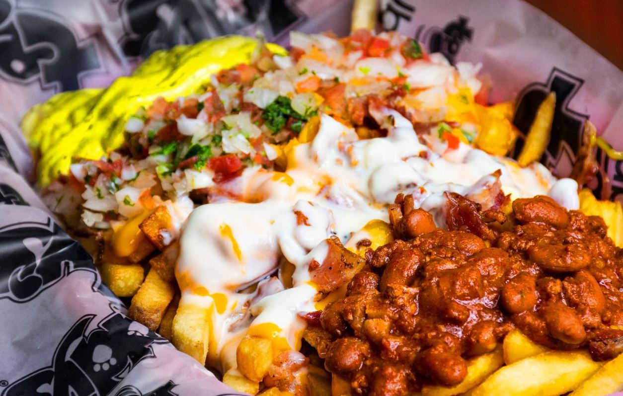 400 g De papas francesas o nachos con salchicha, tocineta, guacamole, pico de gallo, sour cream.