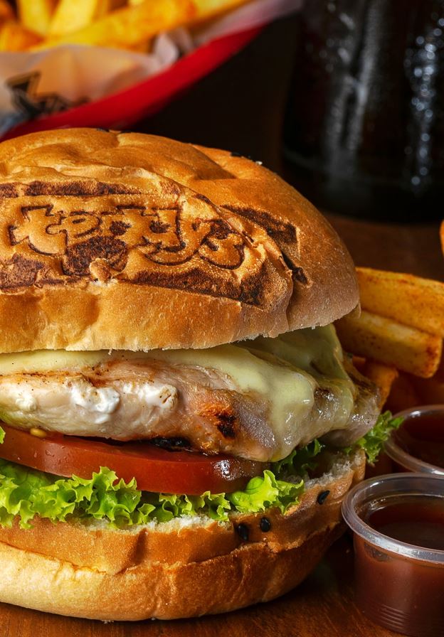 Jugosa pechuga de pollo a la parrilla con queso mozzarella, lechuga, tomate y pan artesanal.