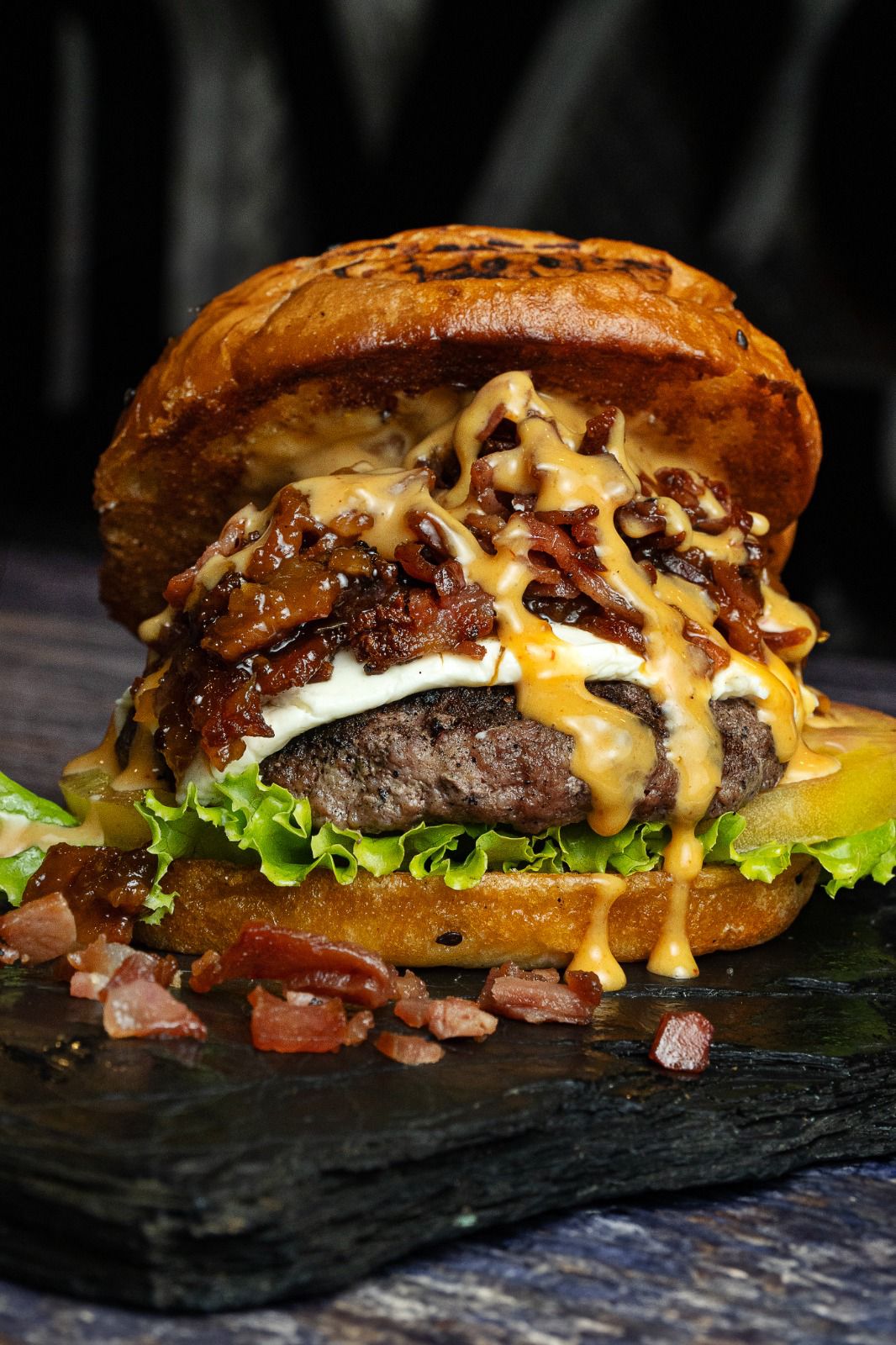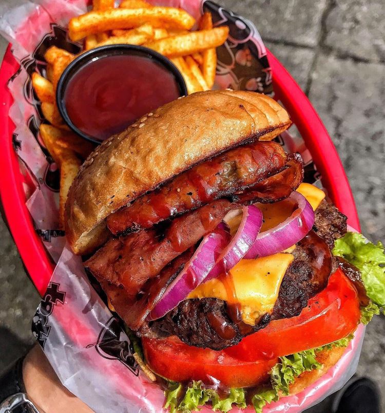 Doble carne de res, doble queso mozzarella, tocineta, cebolla caramelizada, verduras y ripio de papas.