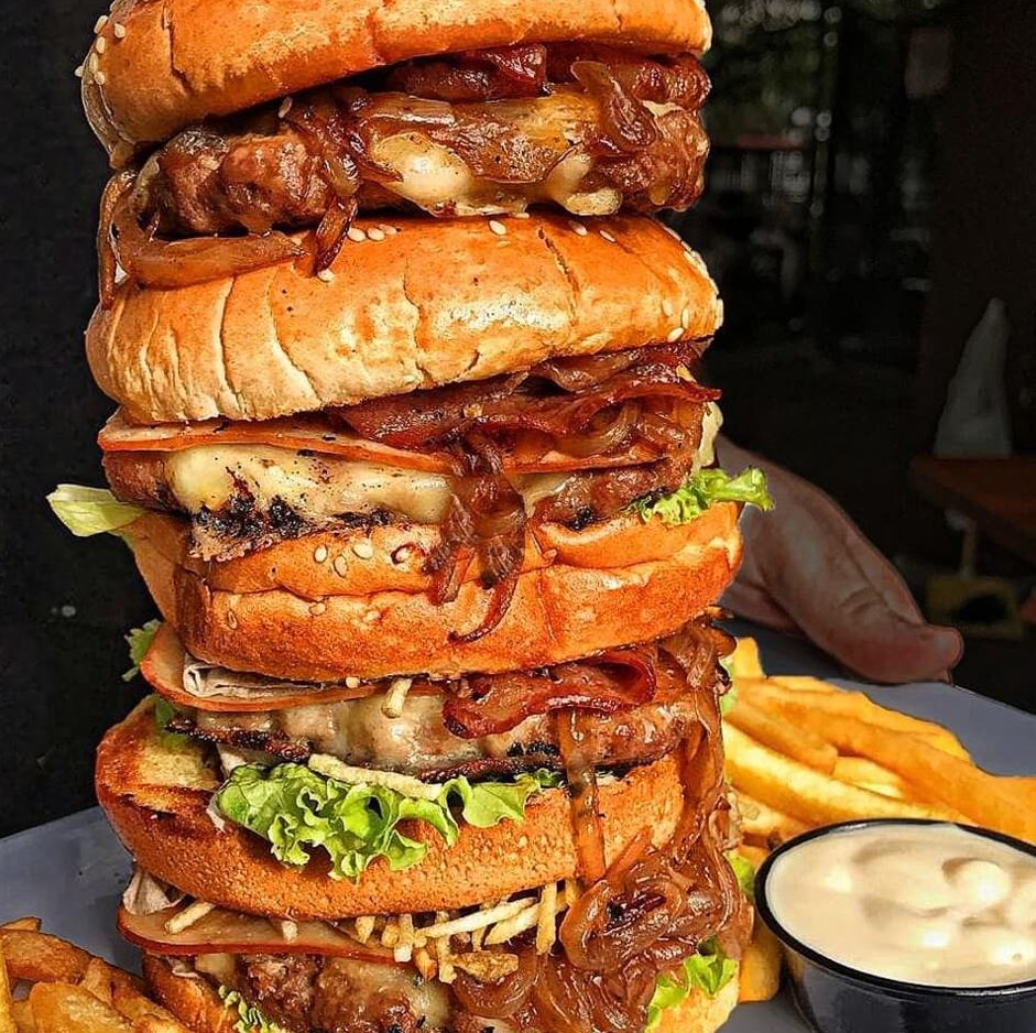 4 Carnes angus de res, 4 quesos mozzarella, 4 tocinetas, triple jamón de pierna, huevo frito, cebolla caramelizada, doble verdura, ripio de papitas y doble pan artesanal.