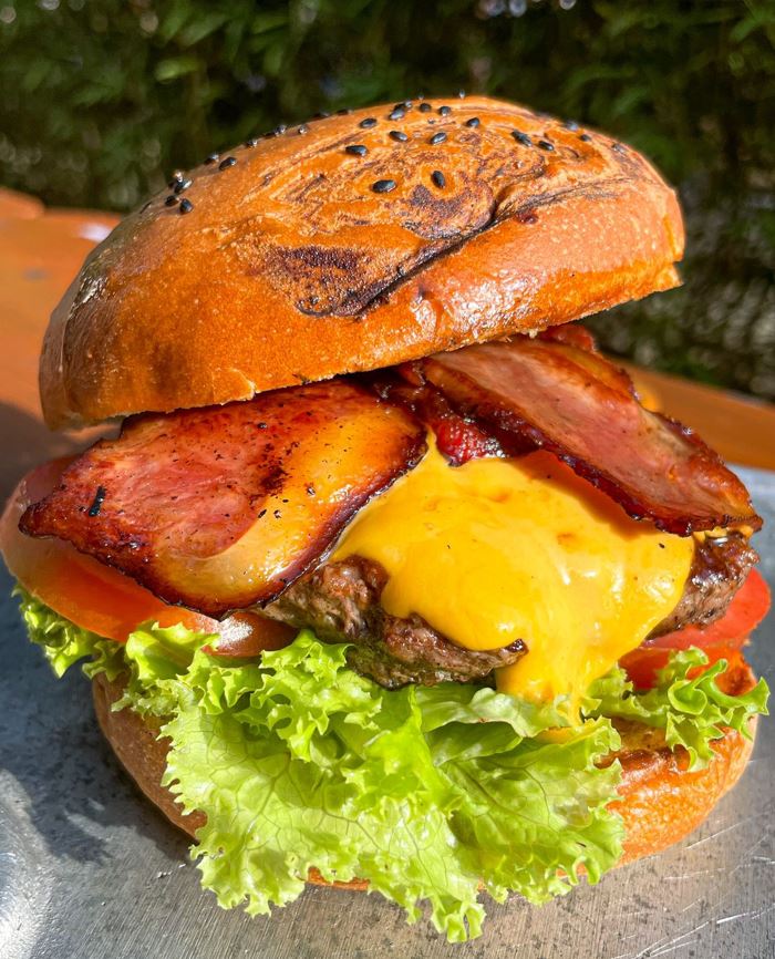 Carne de su elección, queso cheddar, tocineta, tomate, lechuga y pan artesanal.
