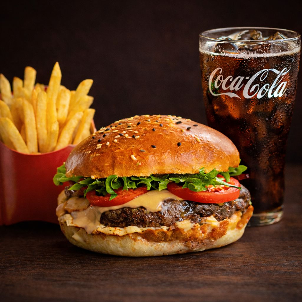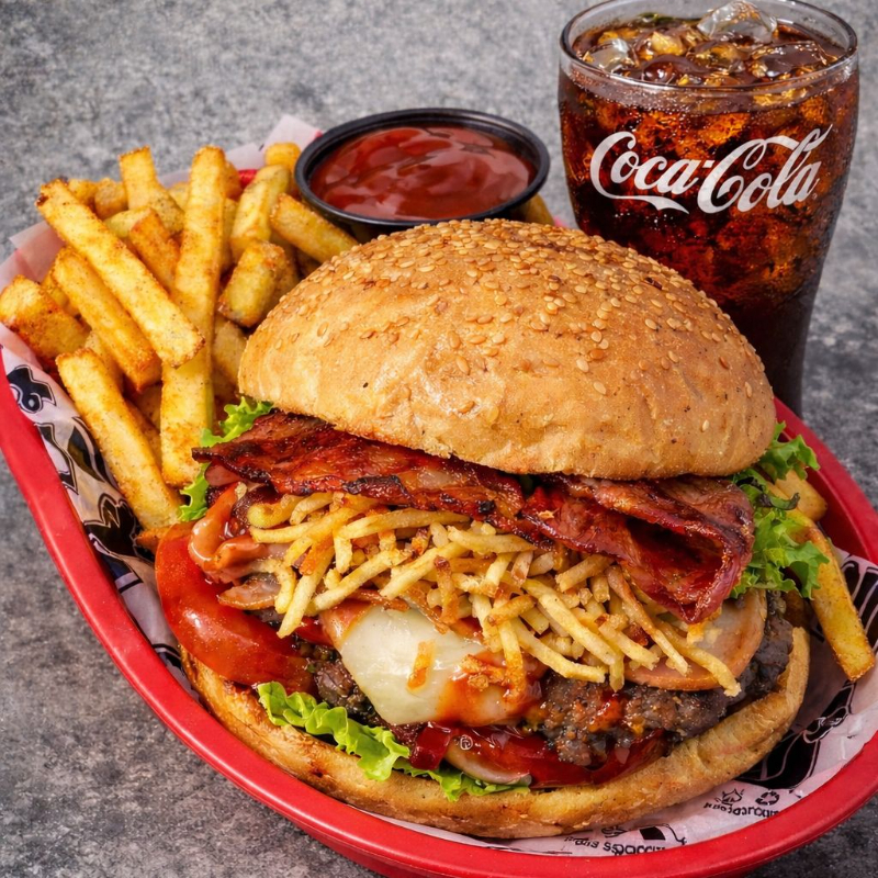 Hamburguesa con carne 80gr angus prime smash a la parrilla, queso americano, tocineta ahumada, salsa pluss + papas + coca cocala zero mini
