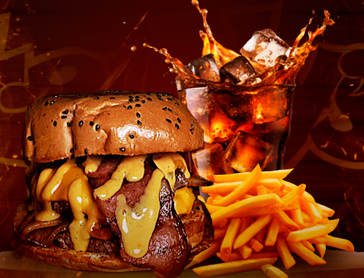 Carne angus, doble queso mozzarella, tocineta, jamón de pierna, ripio de papas y verduras acompañada de papas y gaseosa