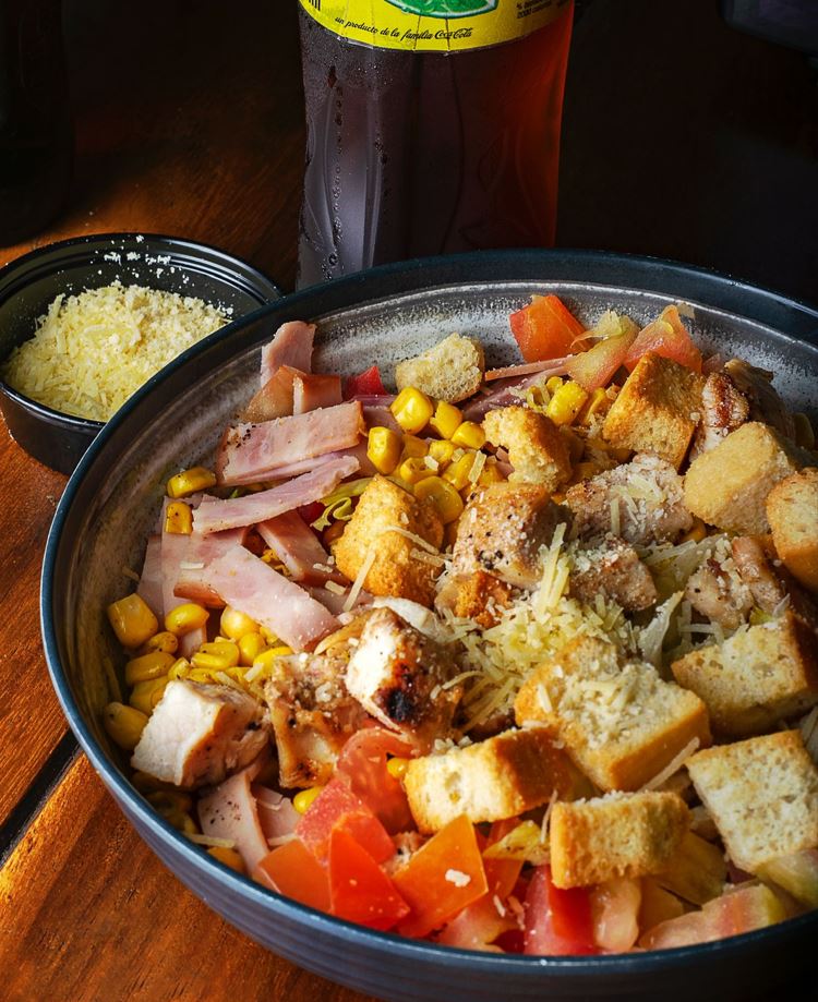 Cuatro jamones, crotones, queso parmesano, pollo a la parrilla, maíz, lechuga, tomate y vinagreta de la casa.