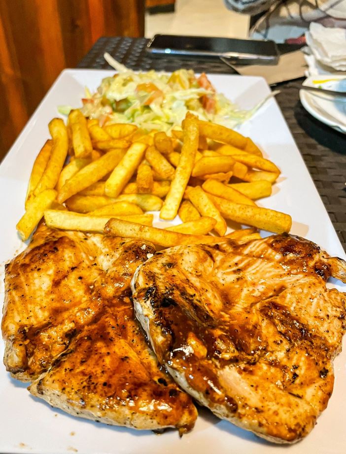 Jugoso filete de pollo a la parrilla, ensalada de la casa y acompañante (papas o yucas).