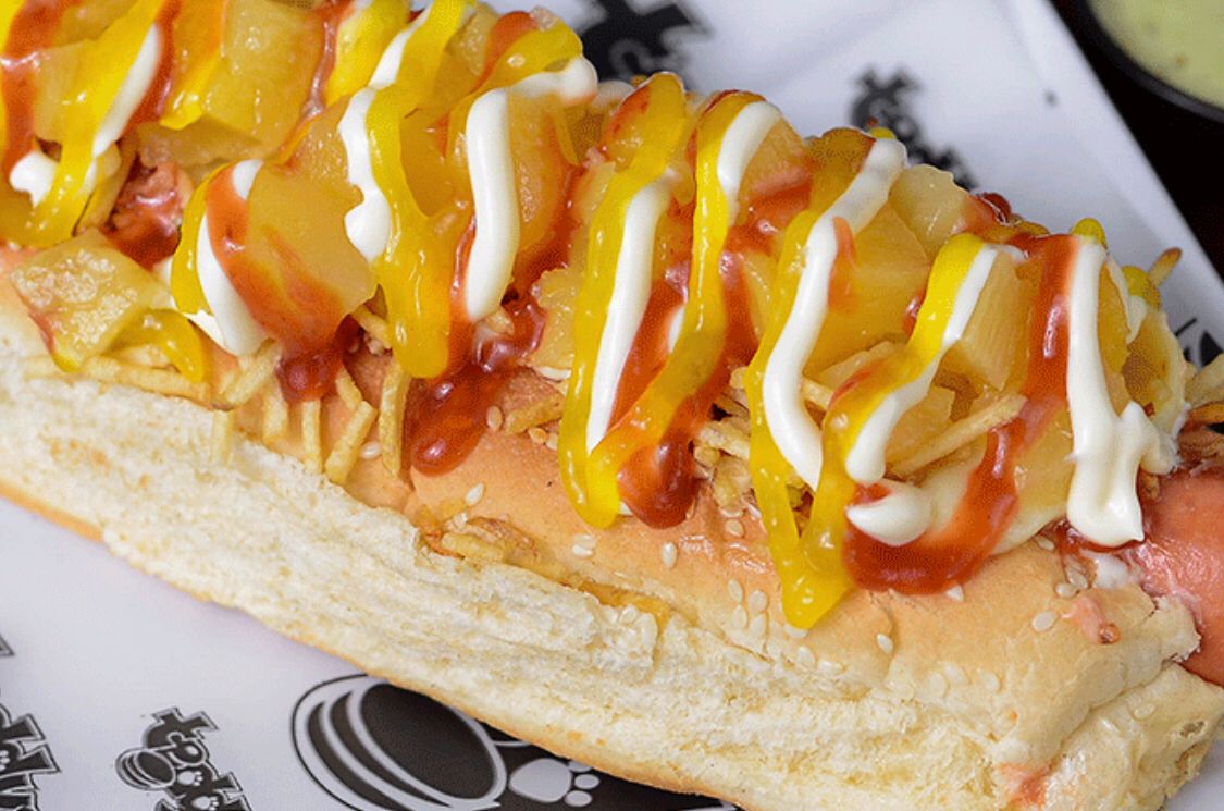 Salchicha premium americana con piña dulce en trocitos y doble queso mozzarella.