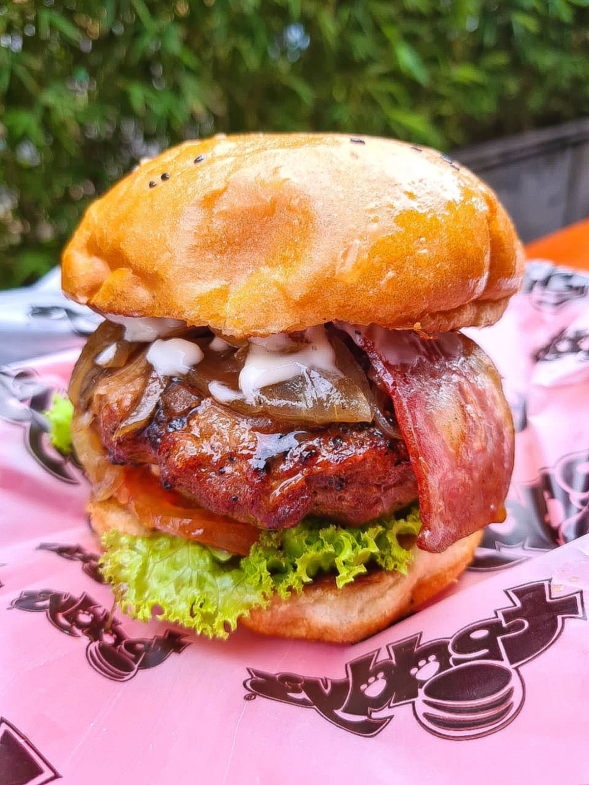 Angus a la parrilla con tocineta ahumada, mermelada de tocineta exclusiva de la casa, queso philadelphia, salsa plus de la casa, lechuga, tomate, pan brioche artesanal sellado en mantequilla
