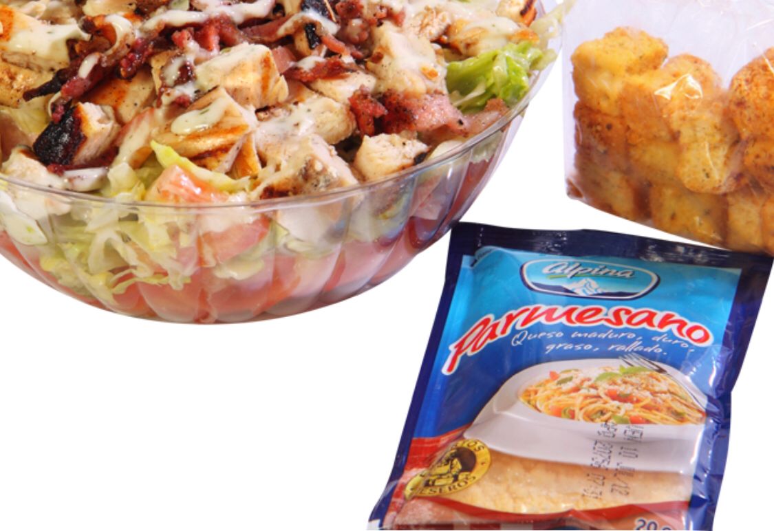 Con doble jamón, crotones, pollo a la parrilla, lechuga, tomate y vinagreta de la casa.