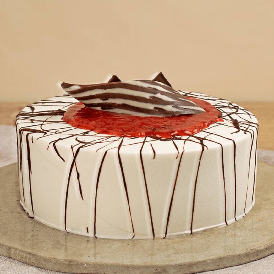 Bizcochuelo artesanal de vainilla relleno y cubierto con salsa natural de fresa y apliques de chocolate.