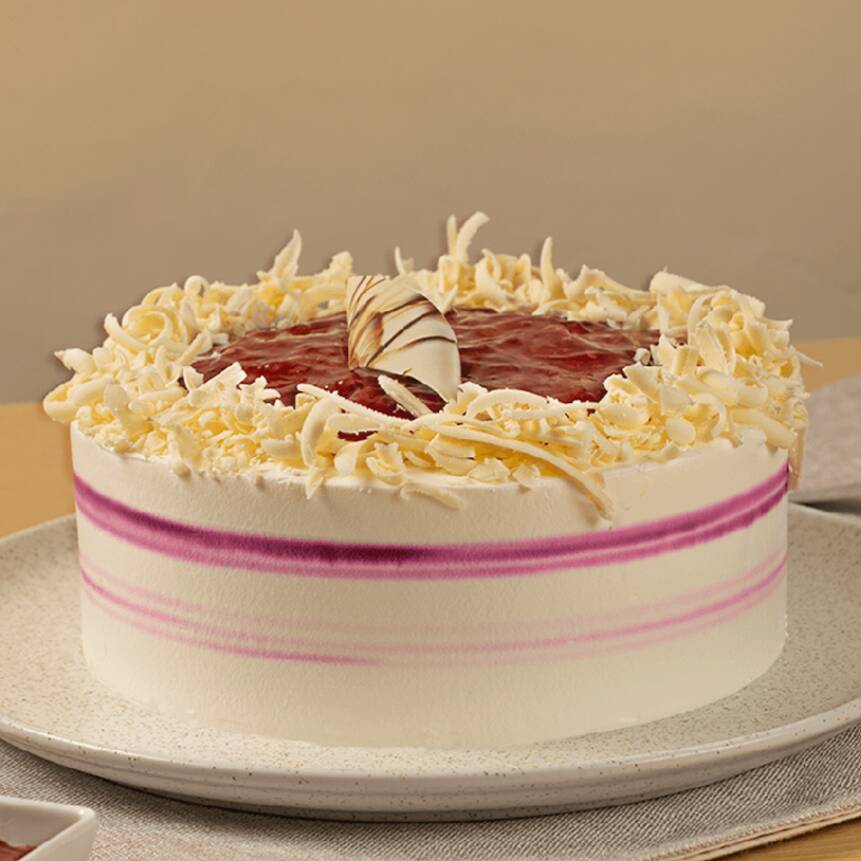 Esponjoso bizcochuelo artesanal de vainilla, que combina la dulzura y acidez de de la mora con la crema de queso. Decorado con salsa de mora y flecos de chocolate blanco.