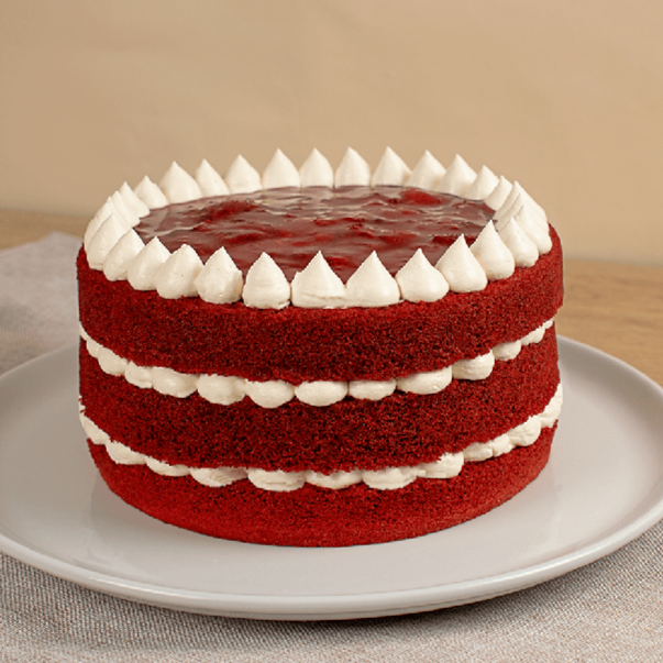 Una experiencia de sabor y pasión disfruta de la riqueza y el romance que combina:tres capas suaves y esponjosas de bizcocho rojo intenso, relleno de crema de queso suave, cremoso y salsa de frutos rojos frescos y jugosos. Tamaño a elegir.