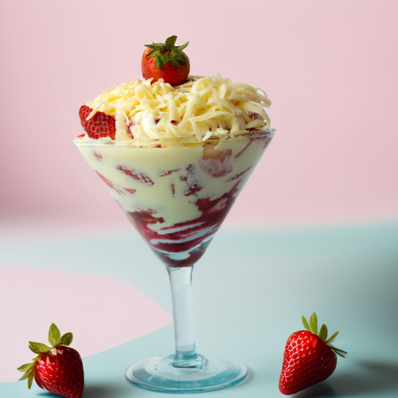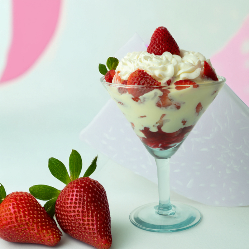 Fresas, crema de la casa, salsa de frutos rojos, chantilly. En domo de 12 onzas.