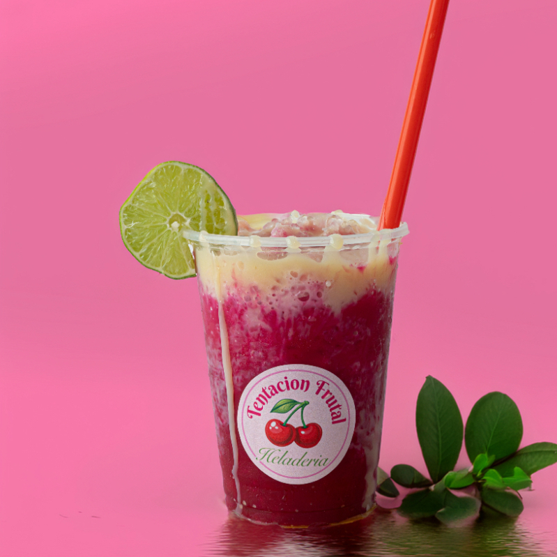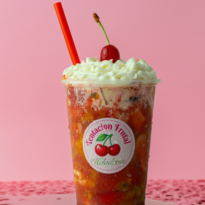 Bebida acompañada de frutas: fresa, piña, manzana, banano, maracuya, mango, uva, helado y chantilly. En envase de 16 onzas.