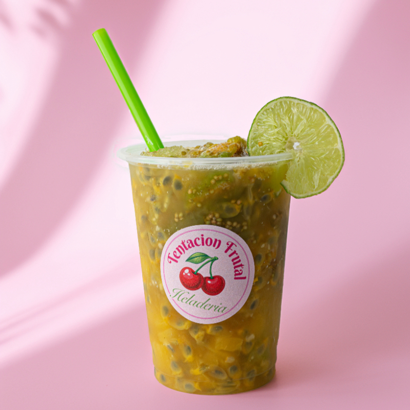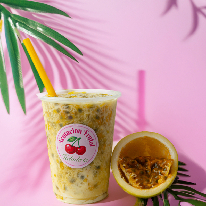 Pulpa de maracuyá, hielo granizado, crema de leche de la casa y lechera. En envase de 16 onzas.