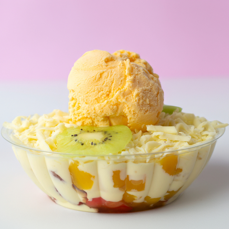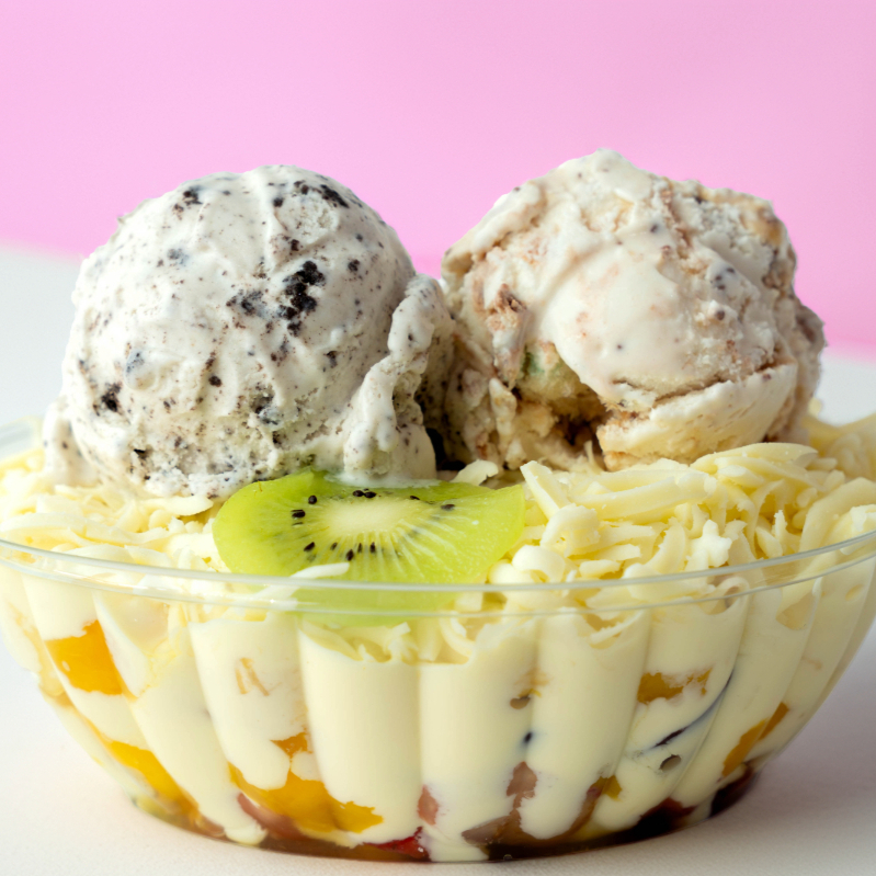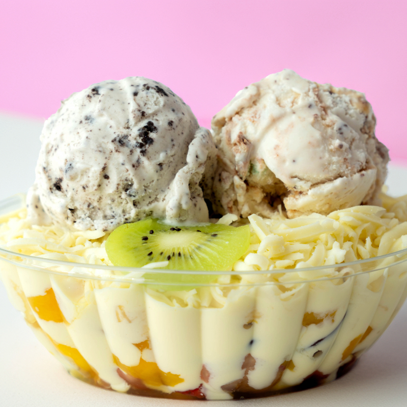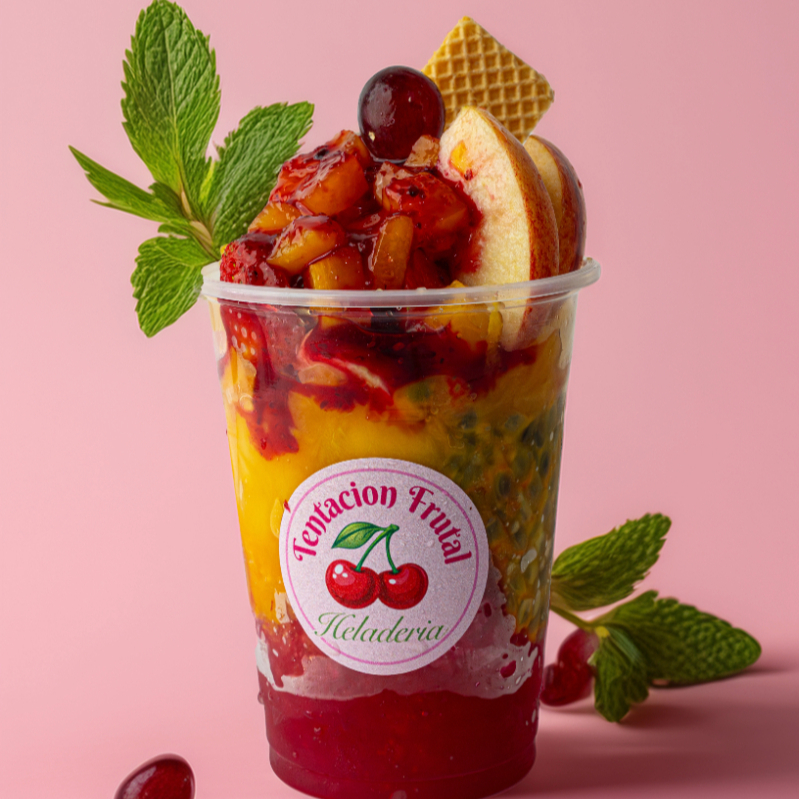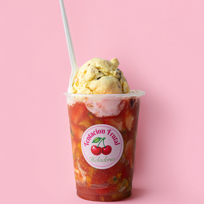 Mix de frutas (Fresa, mango, piña calada, uva, kiwi, banano), crema de la casa, 80 gr. de queso mozzarella 1 bola de helado. 16 Onzas