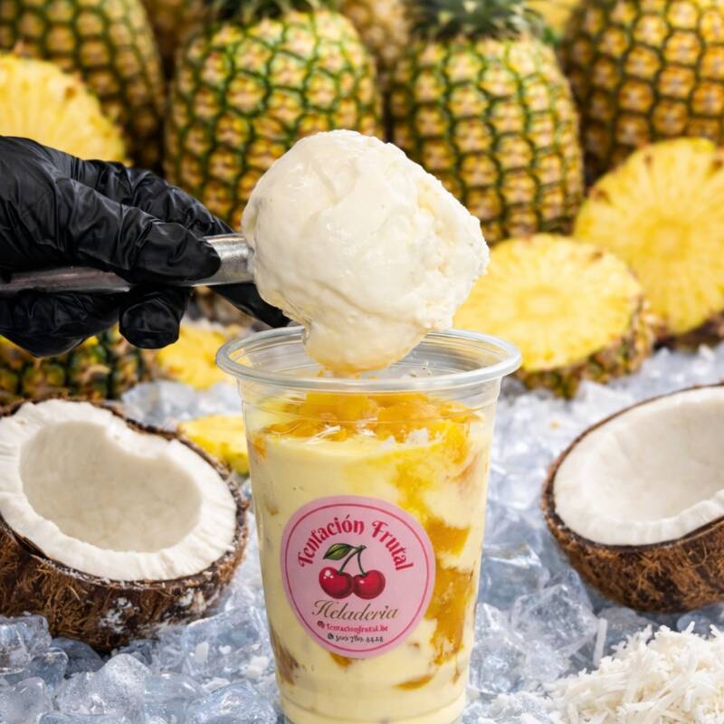 Deliciosa piña calada con la crema de la casa y exquisito helado de piña colada popsy y 1 topping a elección en vaso de 14 onzas.