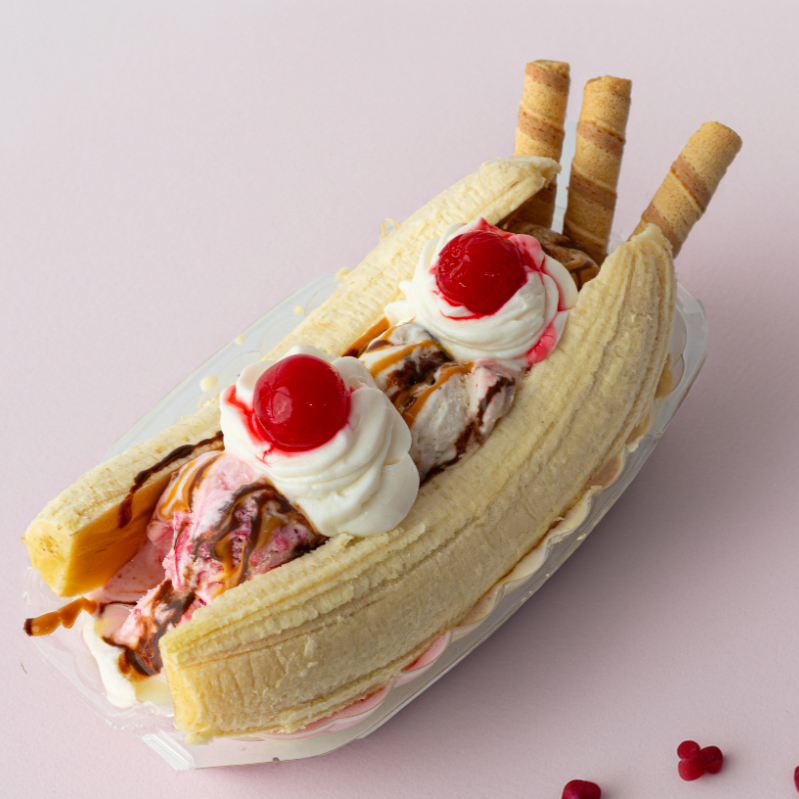 Banano, 3 bolas de helado, cereza, 100 gramos de queso crema, crema de leche de la casa, barquillos, salsa de chocolate y arequipe.