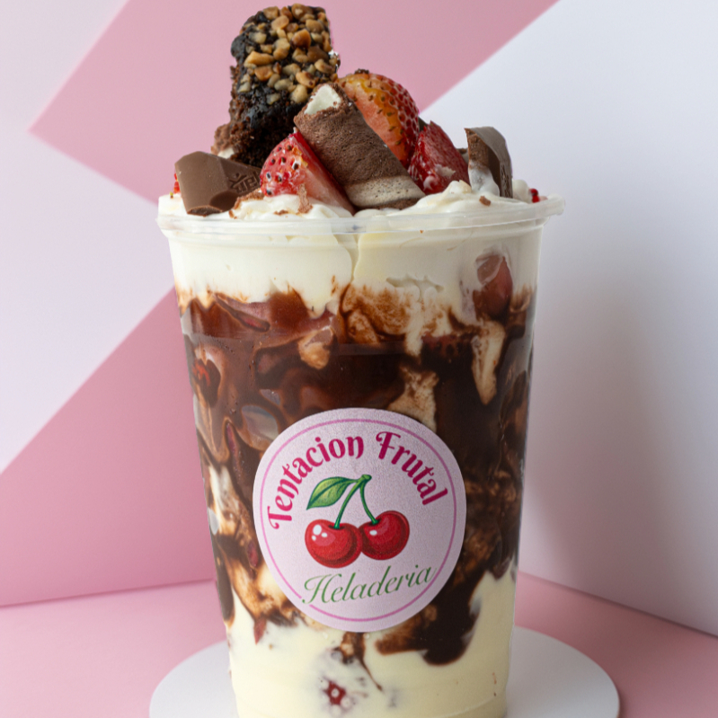 Es de 12 onzas, trae: fresas, crema de la casa, chantillí, salsa de frutos rojos y 1 sabor de helado de tu elección.