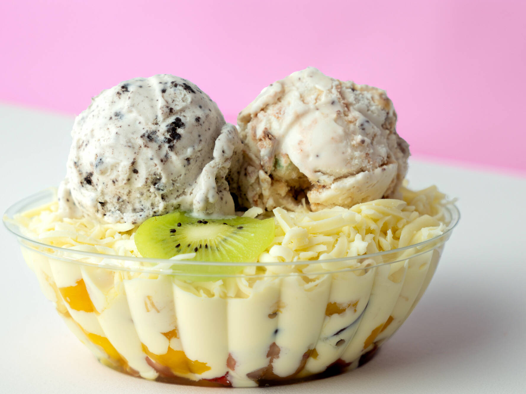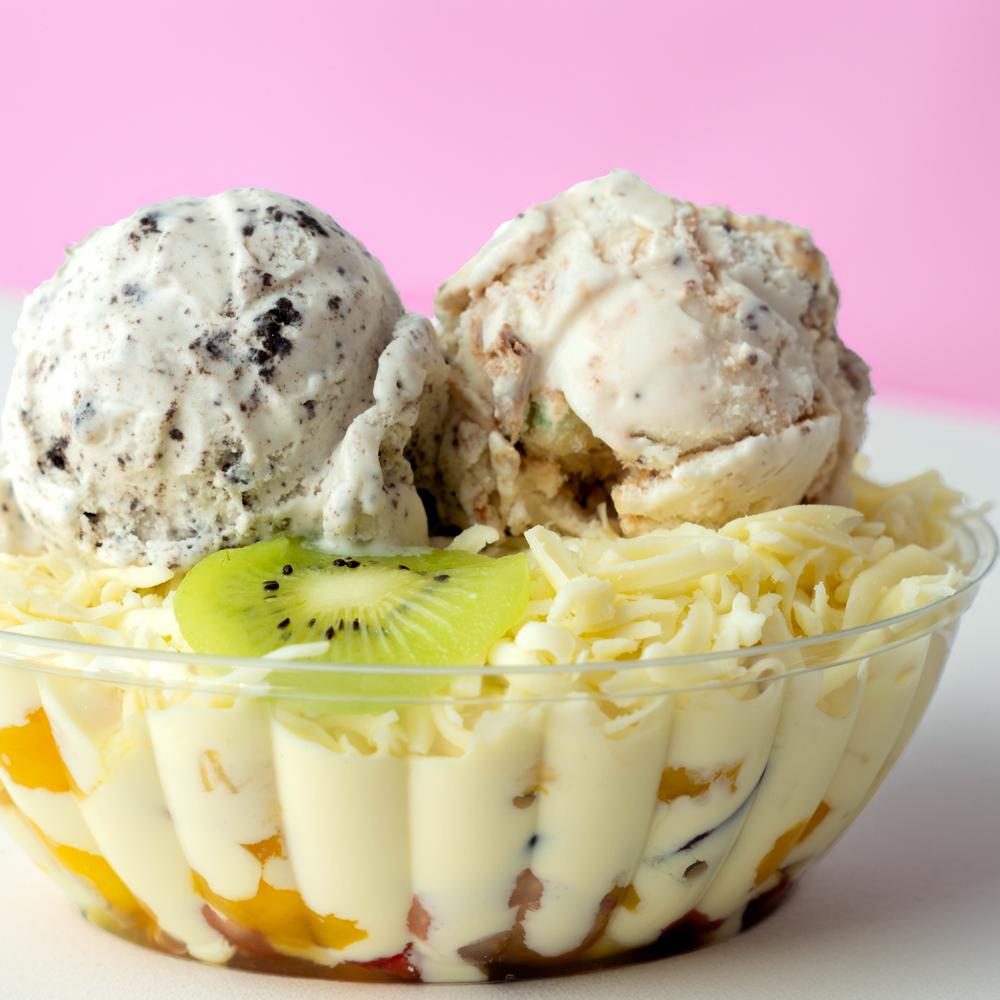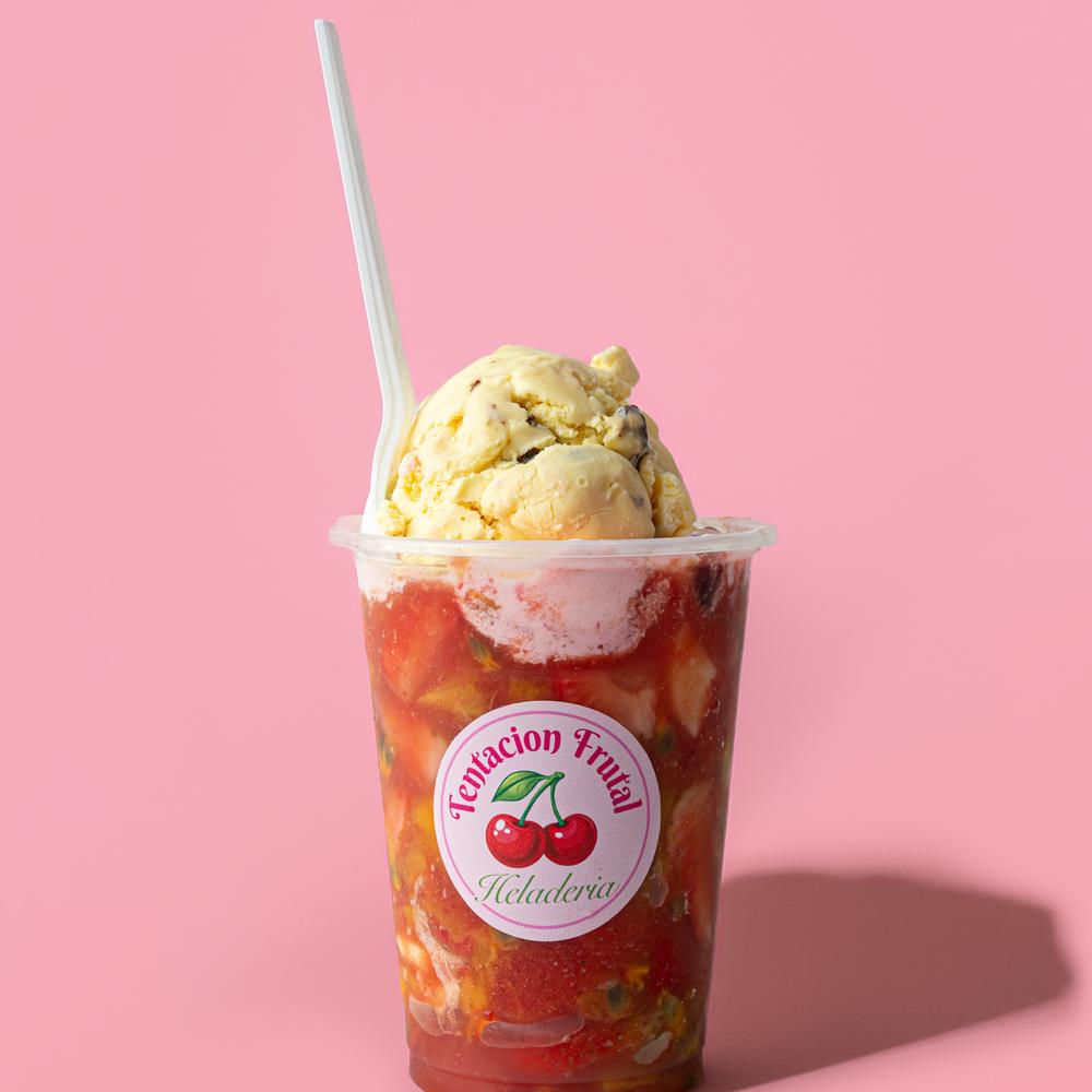Mix de frutas (banano, piña, manzana, uva, kiwi, etc.), crema de leche, queso doble crema y helado