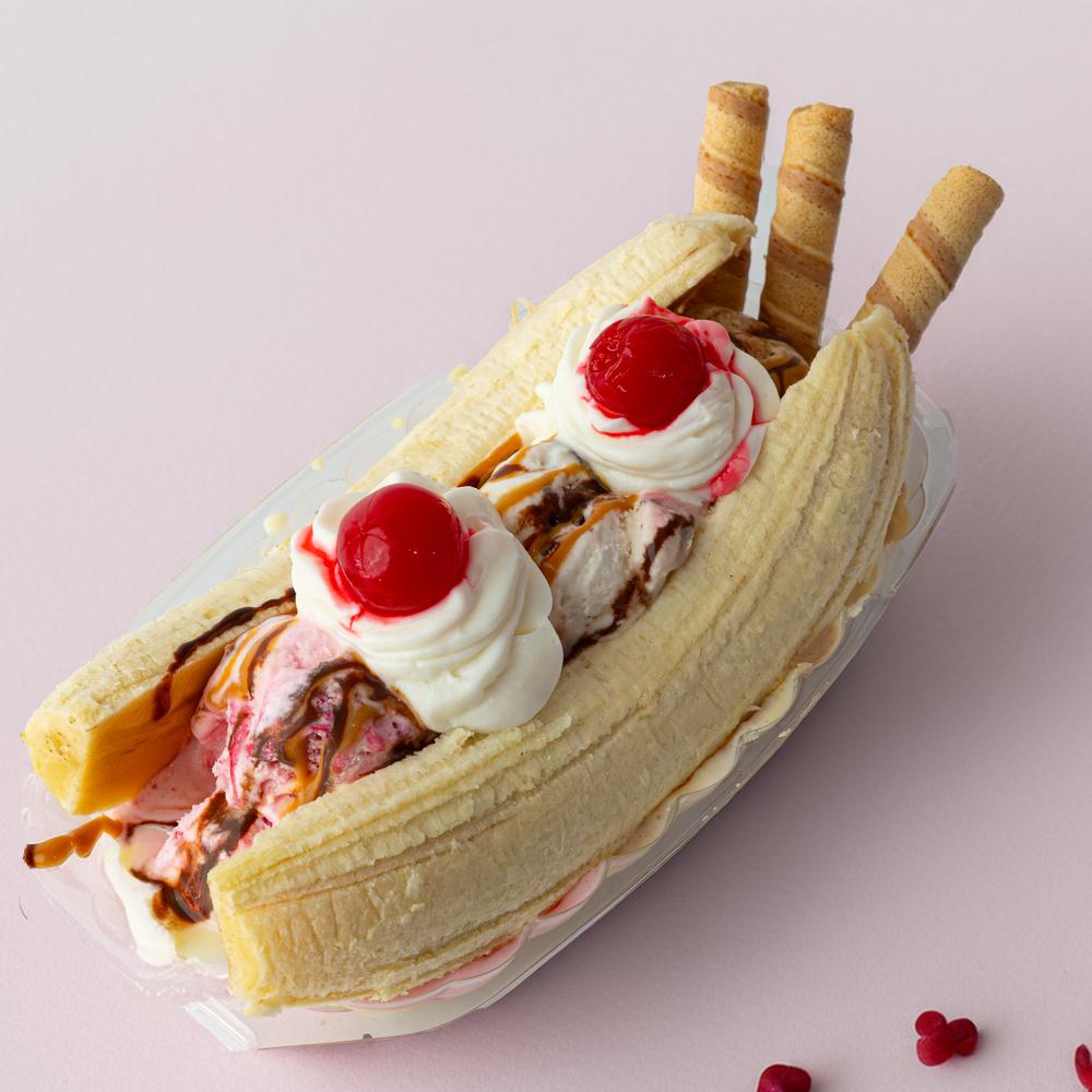 Banana split Banano, crema de leche, 3 bolas de helado, salsa de chocolate, arequipe y barquillos, sin queso