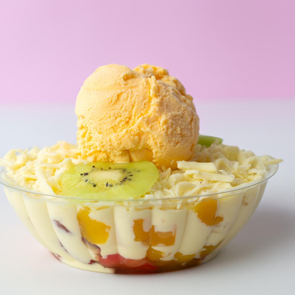 Frutas frescas, helado, leche condensada