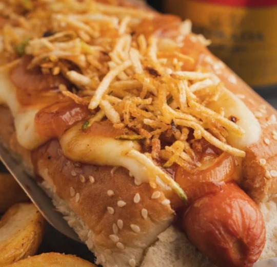 Pan especial, salchicha americana, queso fundido, cebolla caramelizada, ripio y salsa de la casa.