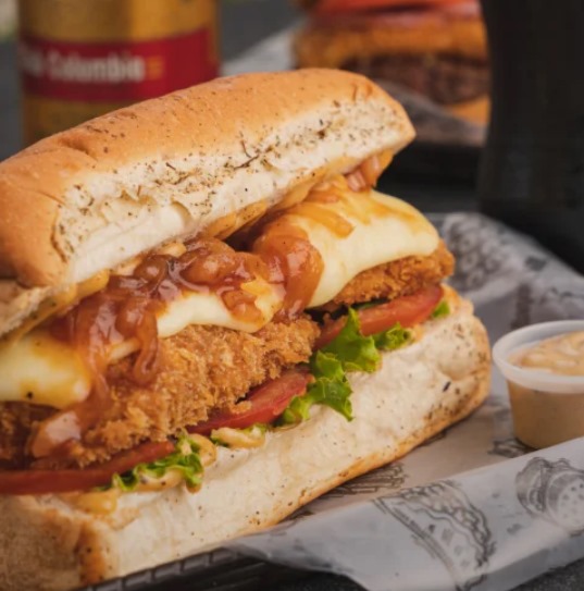 Pan brioche, pollo apanado en panko, queso mozzarella fundido, cebolla caramelizada, tomate y salsa de la casa.