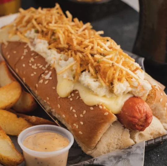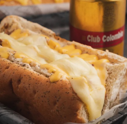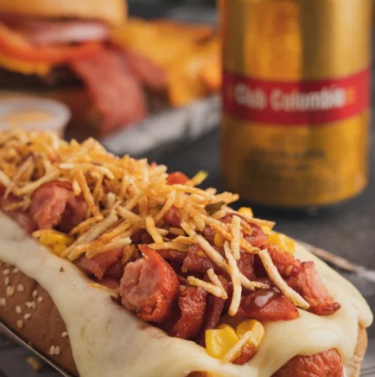 Pan especial, salchicha americana, queso fundido, tocineta, ranchera picada, maicitos, ripio y salsa de la casa.