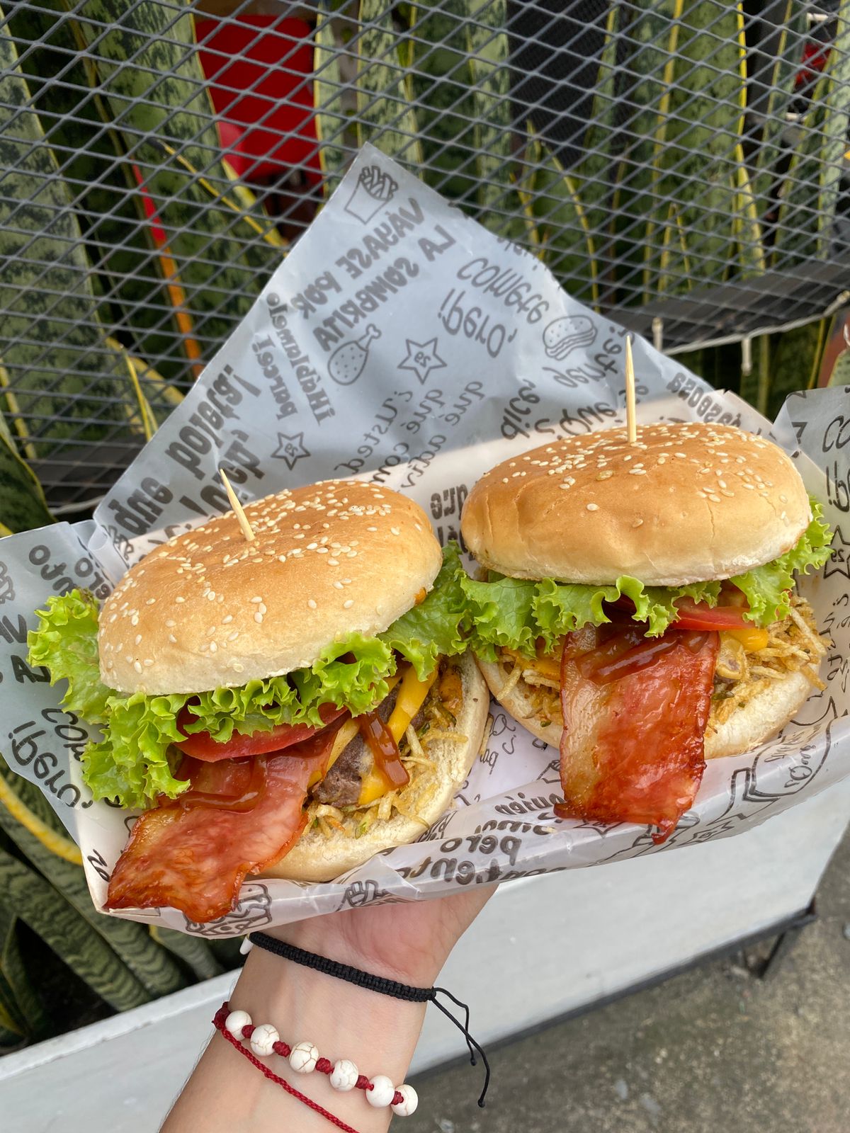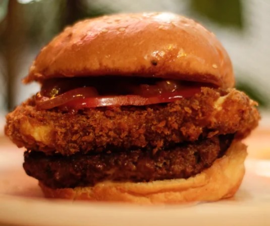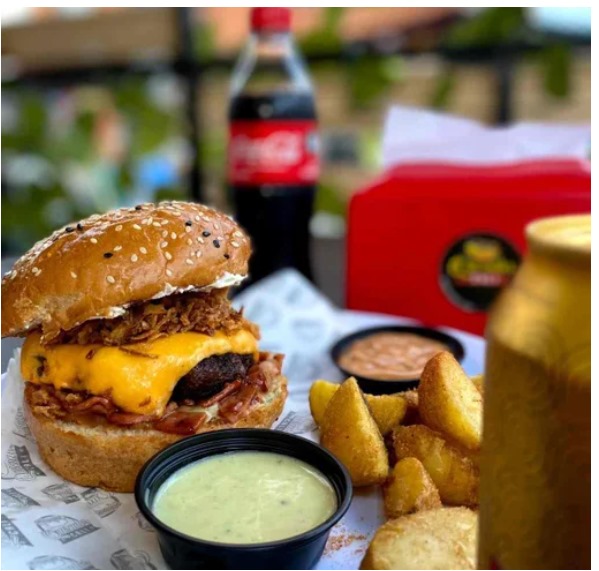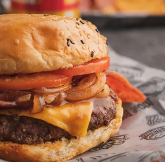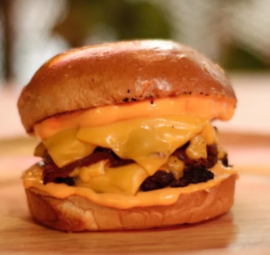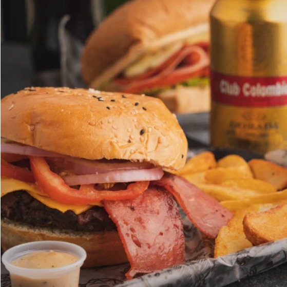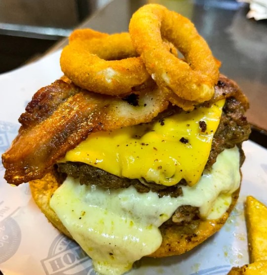 Doble carne angus, queso cheddar, queso mozzarella fundido, doble tocineta, aros de cebolla y tomate.