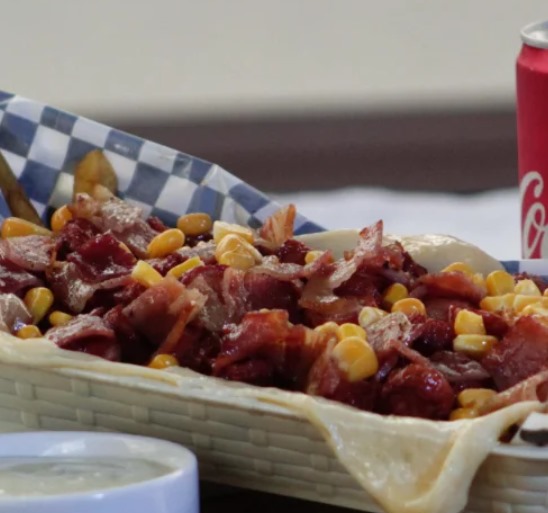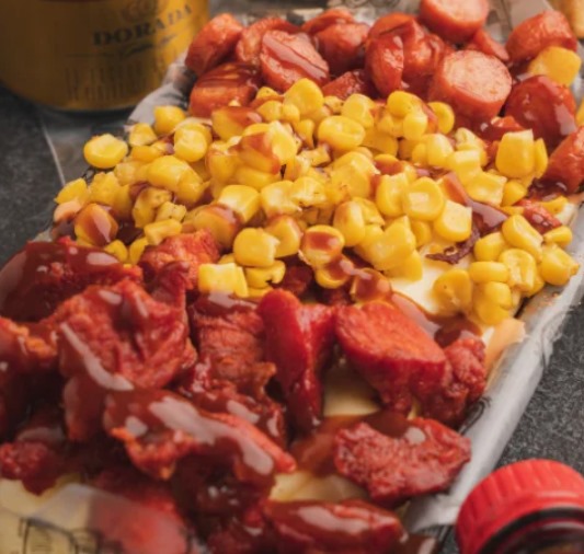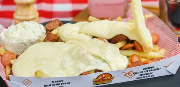 Papas a la francesa, rancheras, queso fundido, costillas BBQ, maicitos y salsa de la casa.