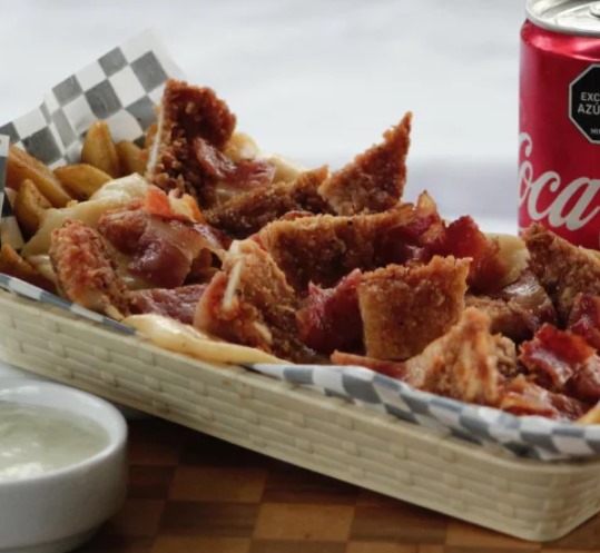 Papas a la francesa, salchicha big, queso fundido, pollo apanado, tocineta y salsa de la casa.