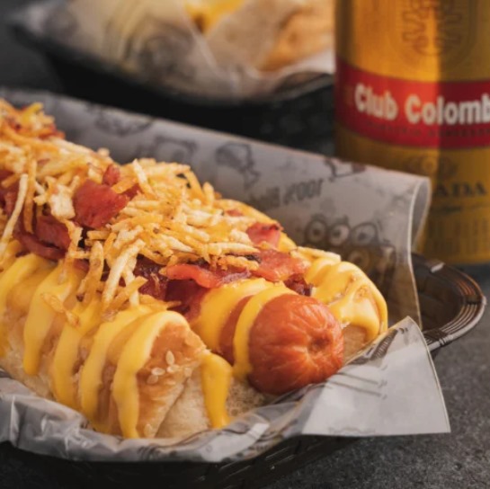 Pan especial, salchicha americana, queso cheddar, doble tocineta, salsa de queso cheddar, ripio y salsa de la casa.