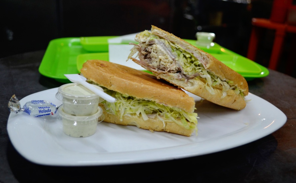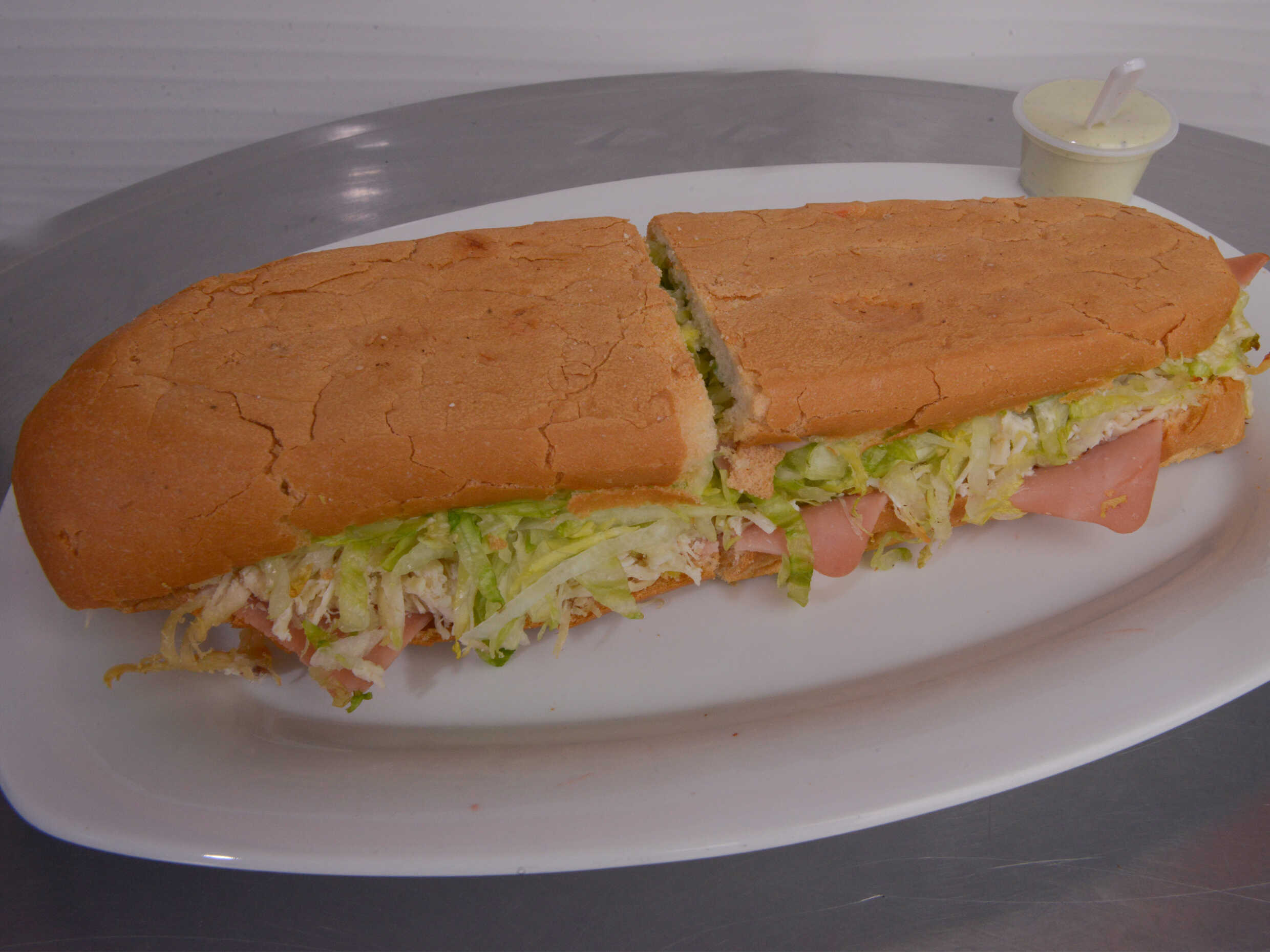 Lechuga, tomate, jamón, queso y salami con exquisita salsa de ajo de la casa, salsa rosada y piña