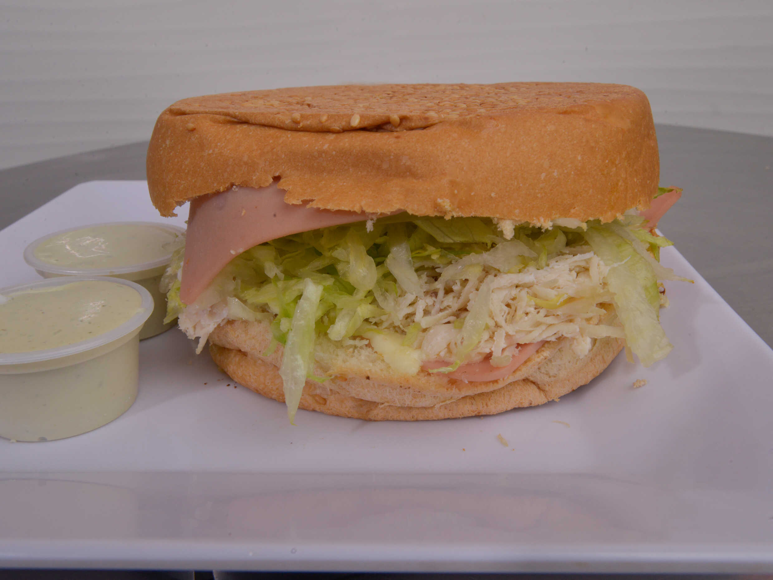 Lechuga, tomate verde, jamón, queso mozarella y pollo con exquisita salsa de ajo de la casa