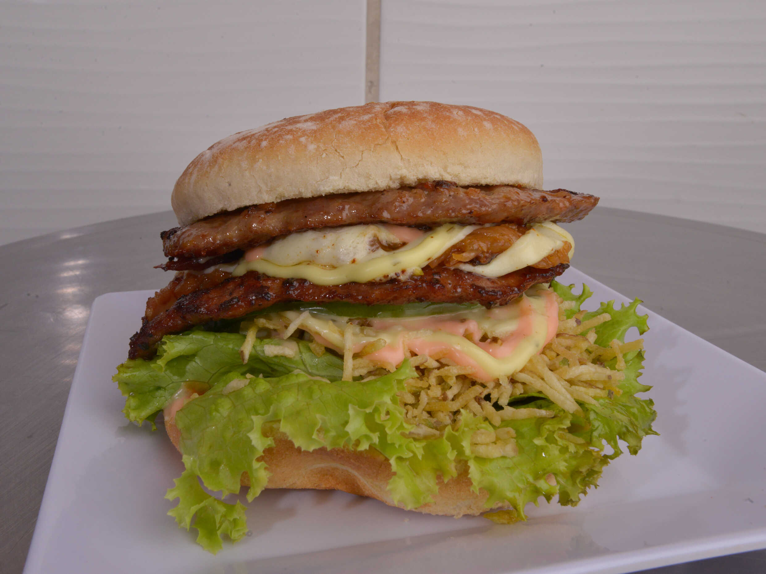 Pan bimbo artesanal,lechuga, tomate, doble carne, doble queso mozzarella, doble tocineta, cebolla caramelizada, ripio, salsas