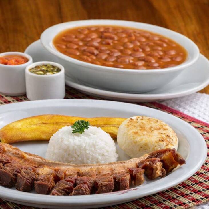 Arroz, frijoles, chicharrón, maduro, aguacate.