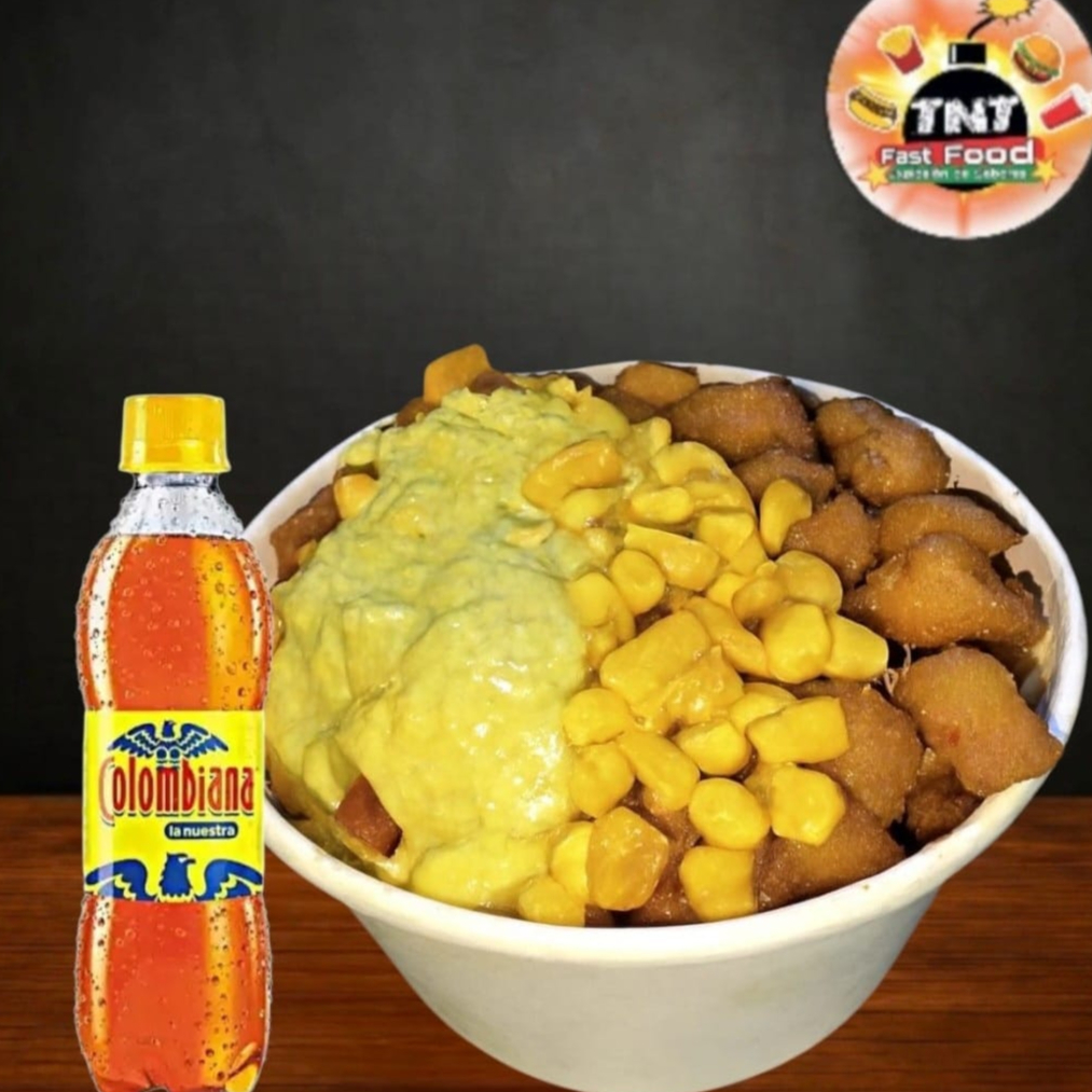 Bowl 32 onzas de salchipapa con mix de papa criolla y papa francesa 100 artesanal, salchicha americana, maíz dulce, ripio de papa, queso doble crema, salsa de la casa. mas gaseosa 250 ml.