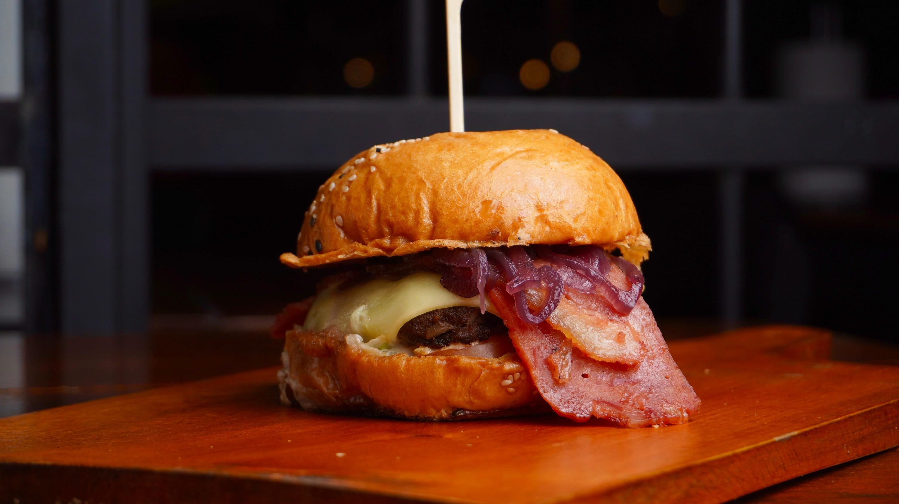 Hamburguesa Especial Pan brioche suave, jugosa carne 100 % Angus, tocineta ahumada, mezcla de quesos gratinados, cebolla caramelizada en reducción de vino tinto, tomate fresco, lechuga crujiente y salsa de la casa. Acompañada de una porción de papas a elección.