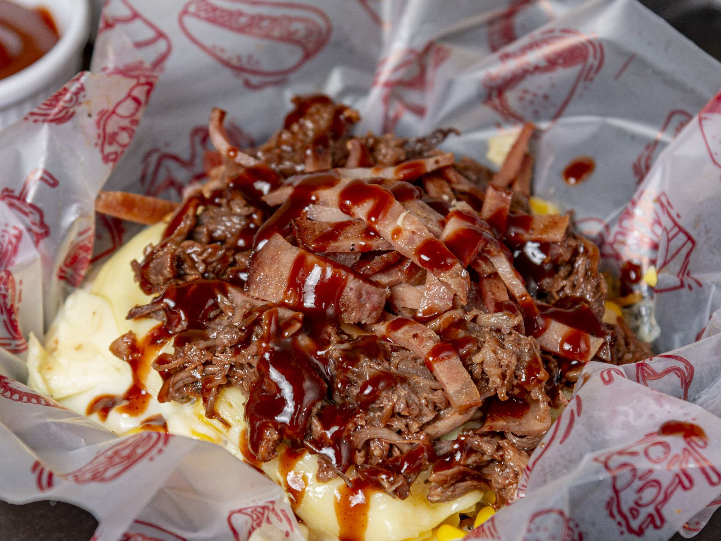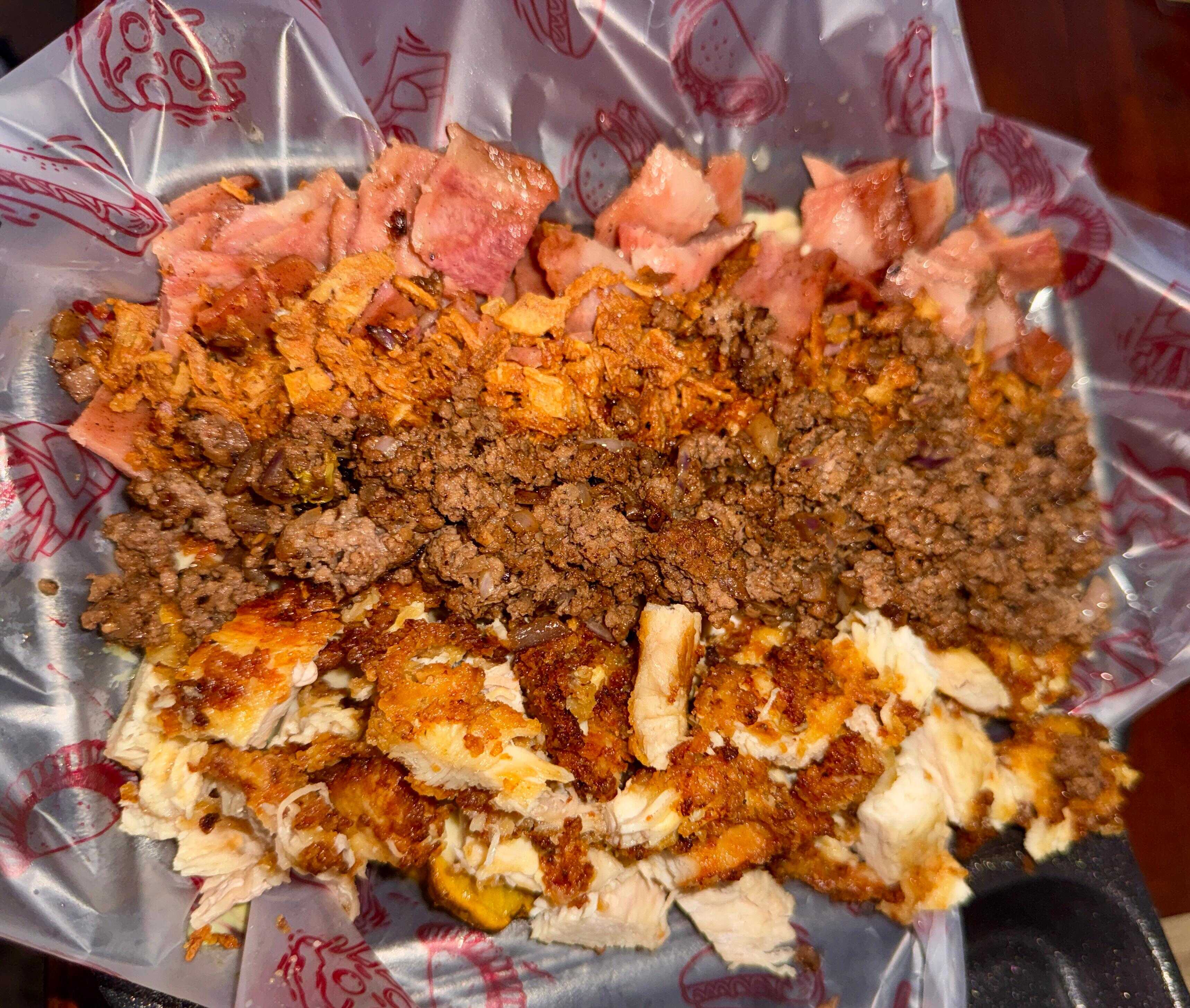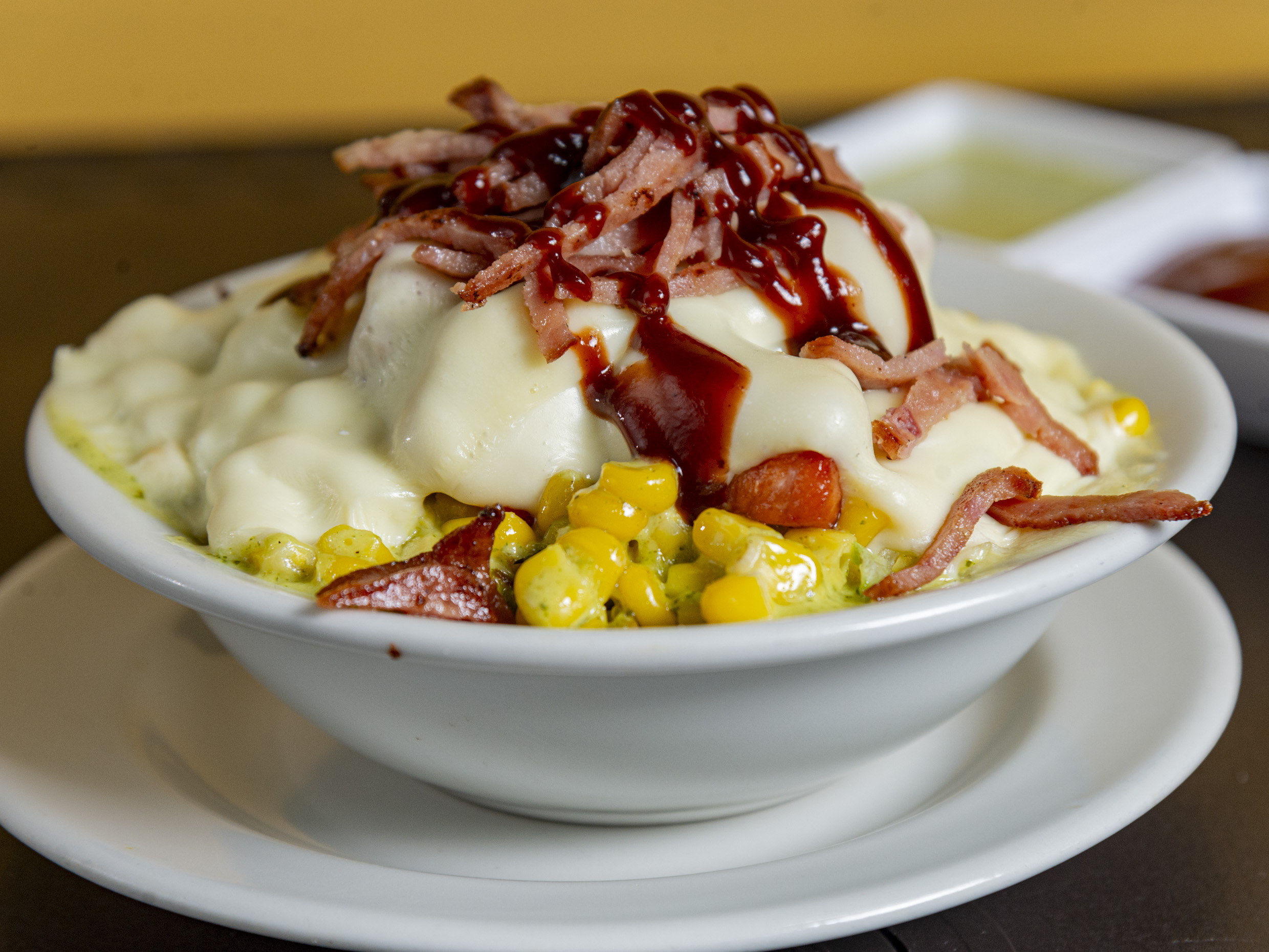 Papa criolla o francesa, salchicha ranchera, carne molida, pollo crocante, tocineta, fusión de queso gratinado, cebolla crocante y salsa de la casa.