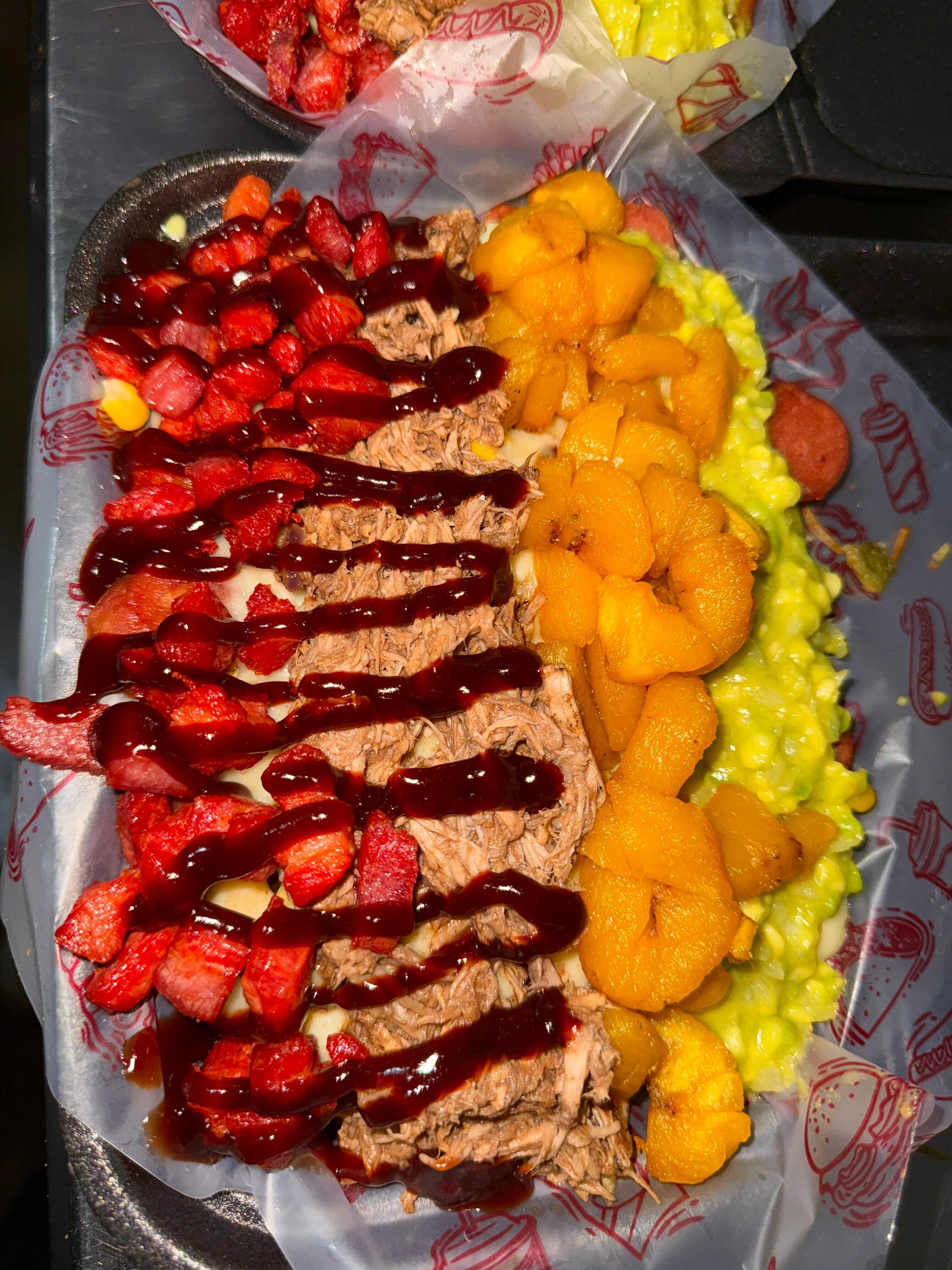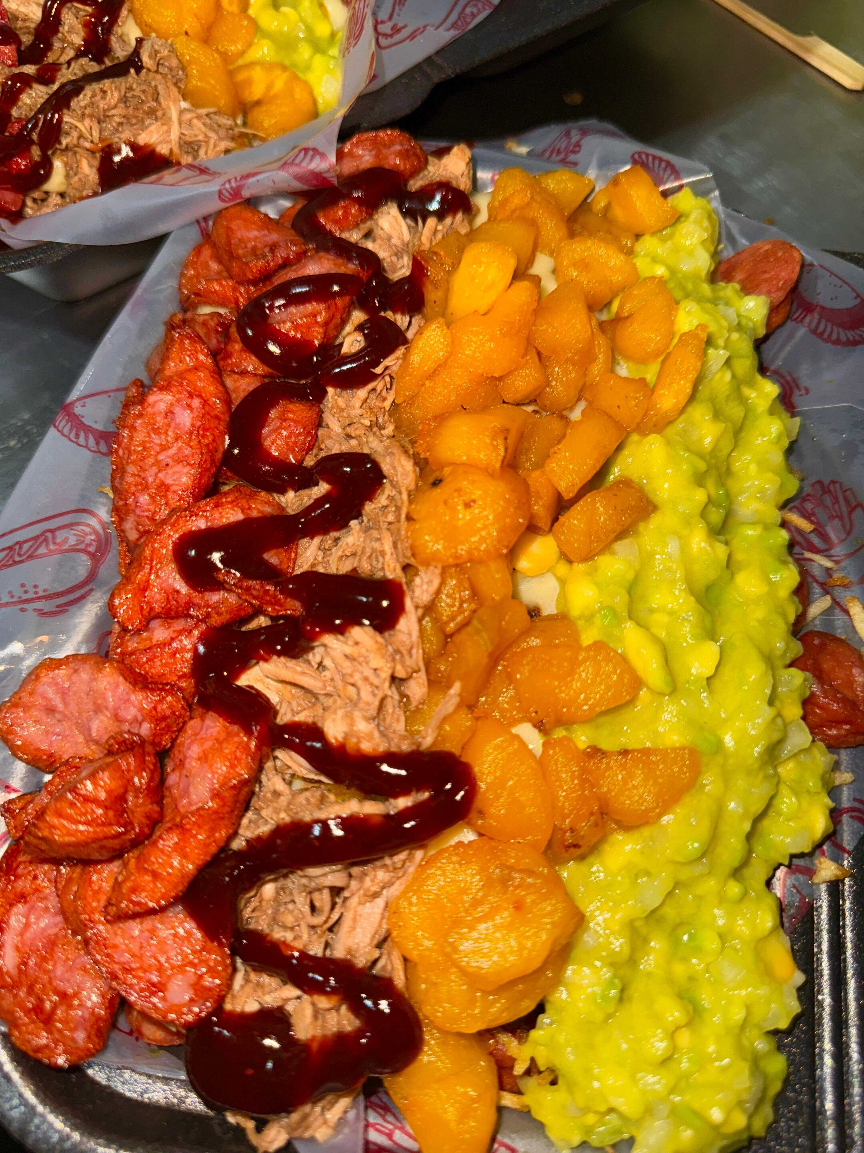 Papa criolla o francesa, salchicha, salchicha ranchera, carne de cerdo en BBQ, maduritos, maicitos, guacamole, fusión de queso gratinado, ripio de papas y salsa de la casa.