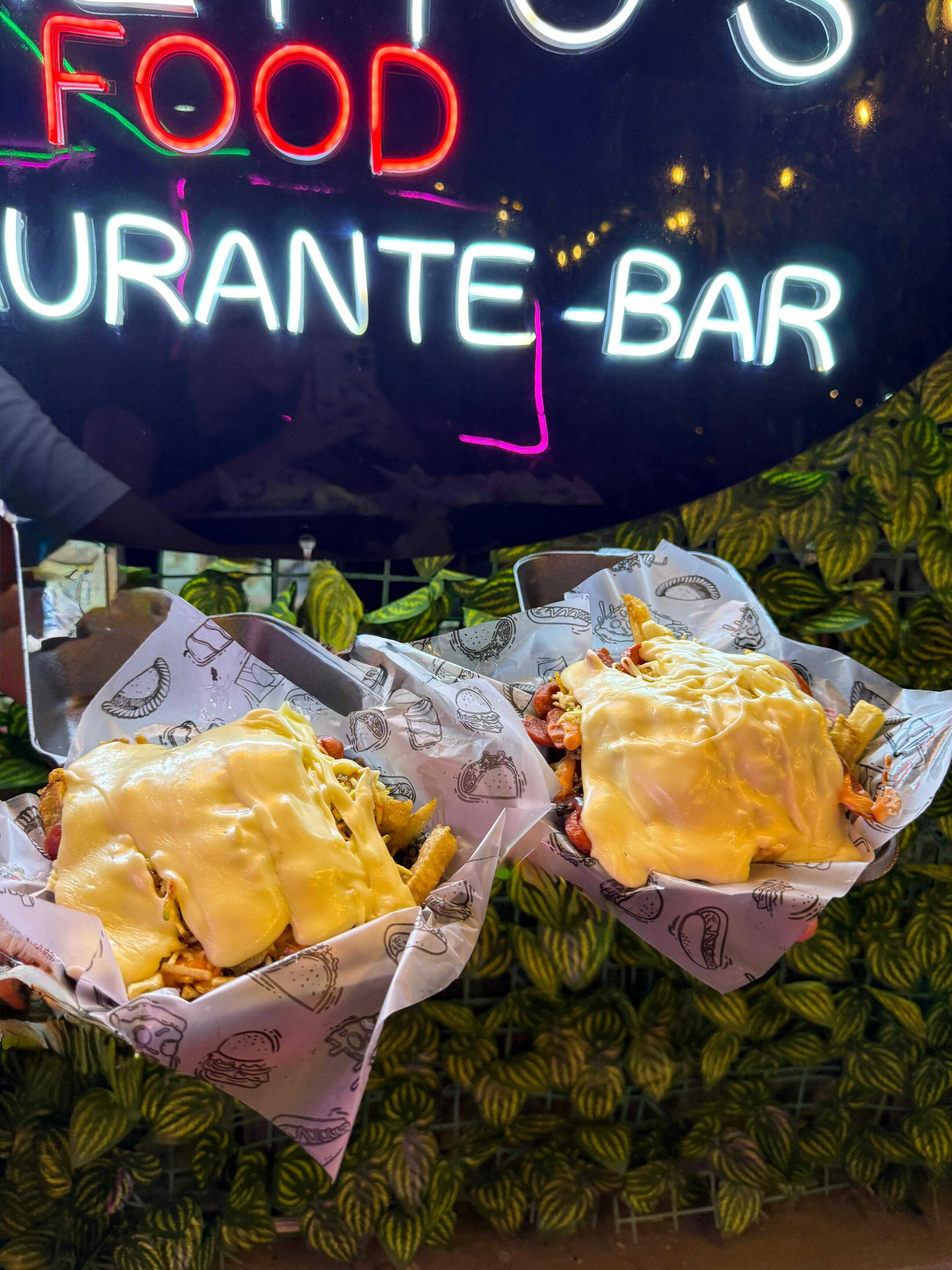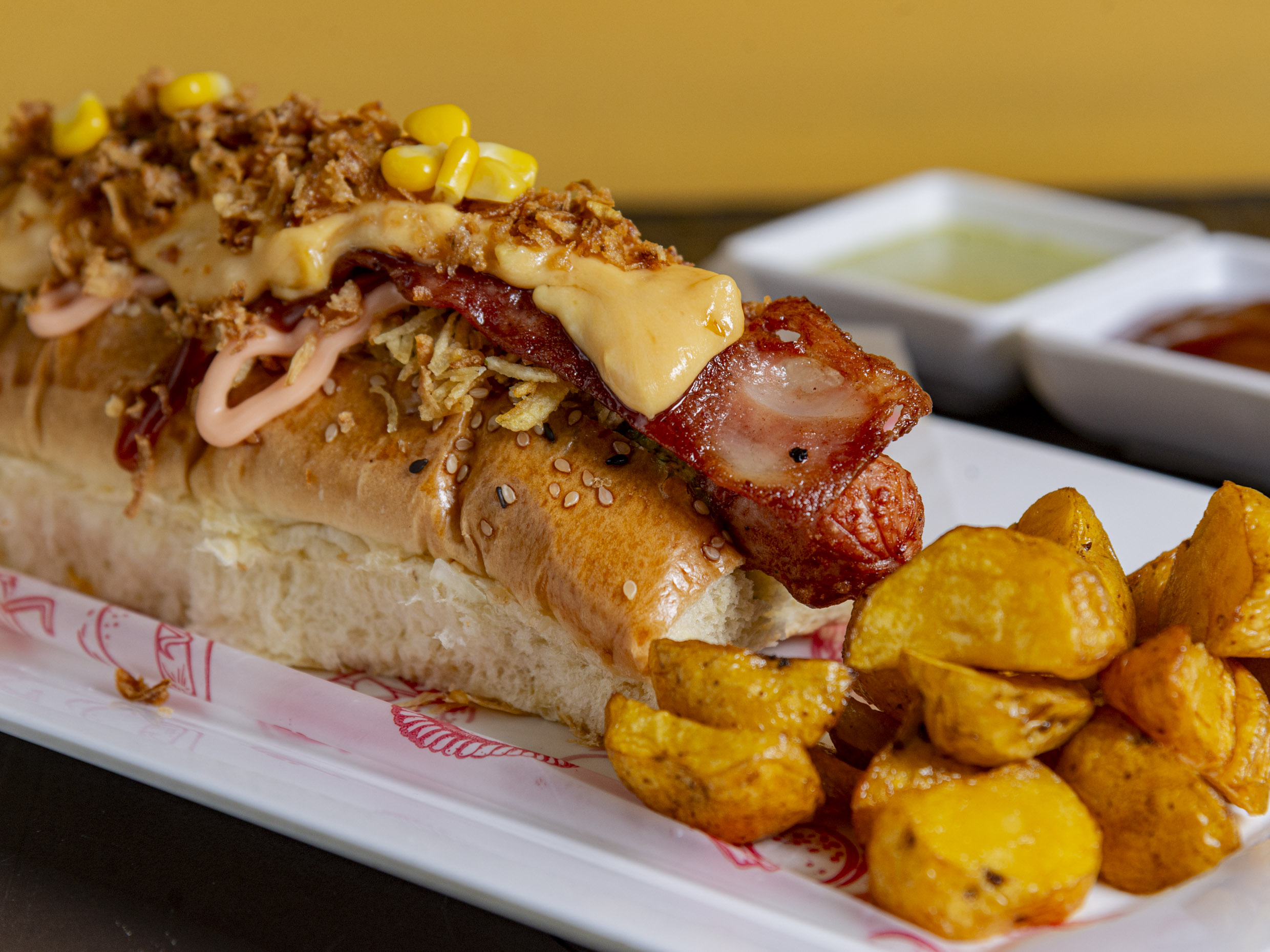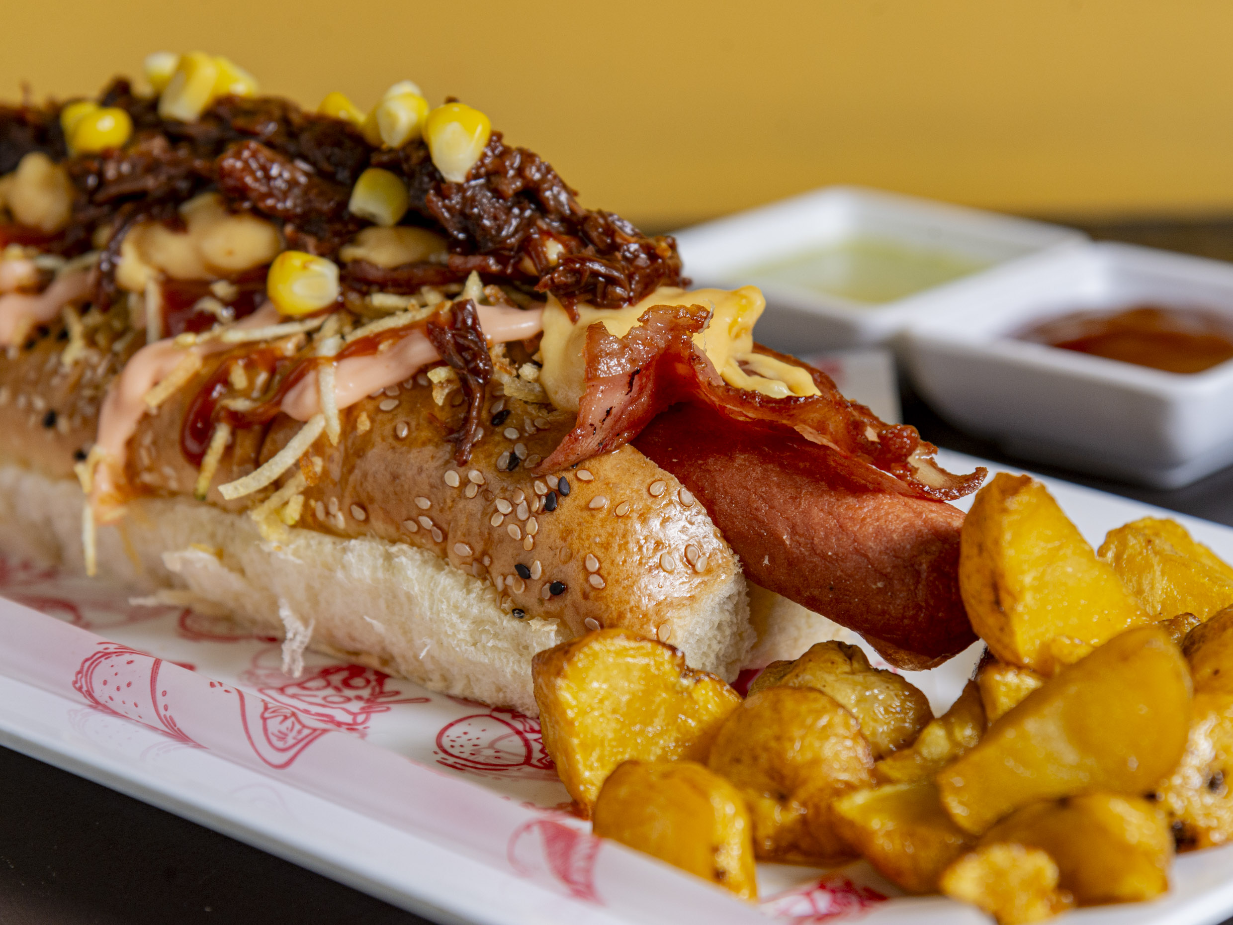 Dos Deliciosos Perros Maduro con pan brioche, salchicha americana, tocineta ahumada, madurito, tomate y cebolla picado, ripio de papa, maicitos, fusión de queso gratinado, y salsas.