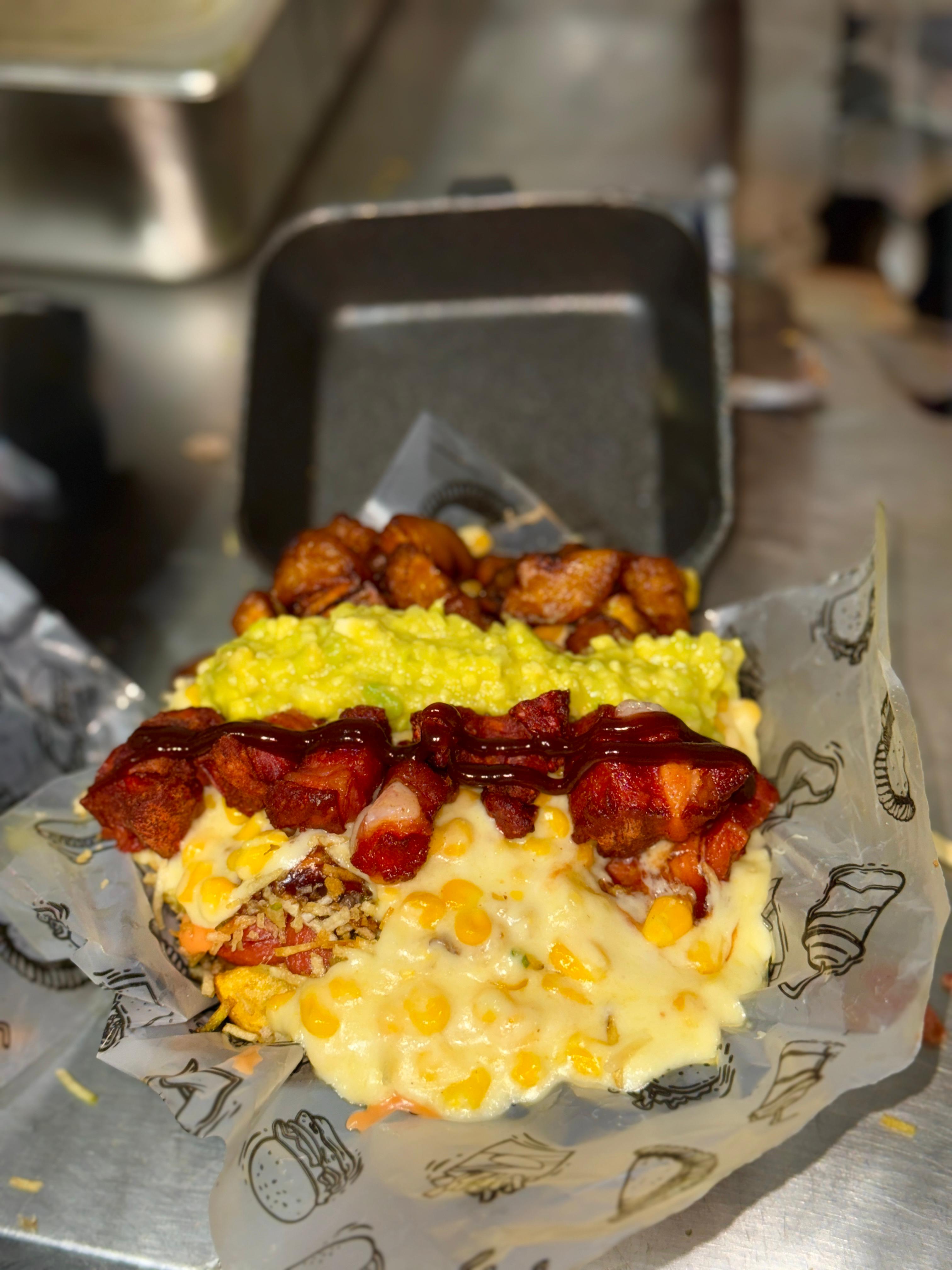 Papa criolla o francesa, salchicha, carne de cerdo desmechada, madurito, maicitos, guacamole, costilla ahumada, ripio de papa, fusión de queso gratinado y salsa de la casa.