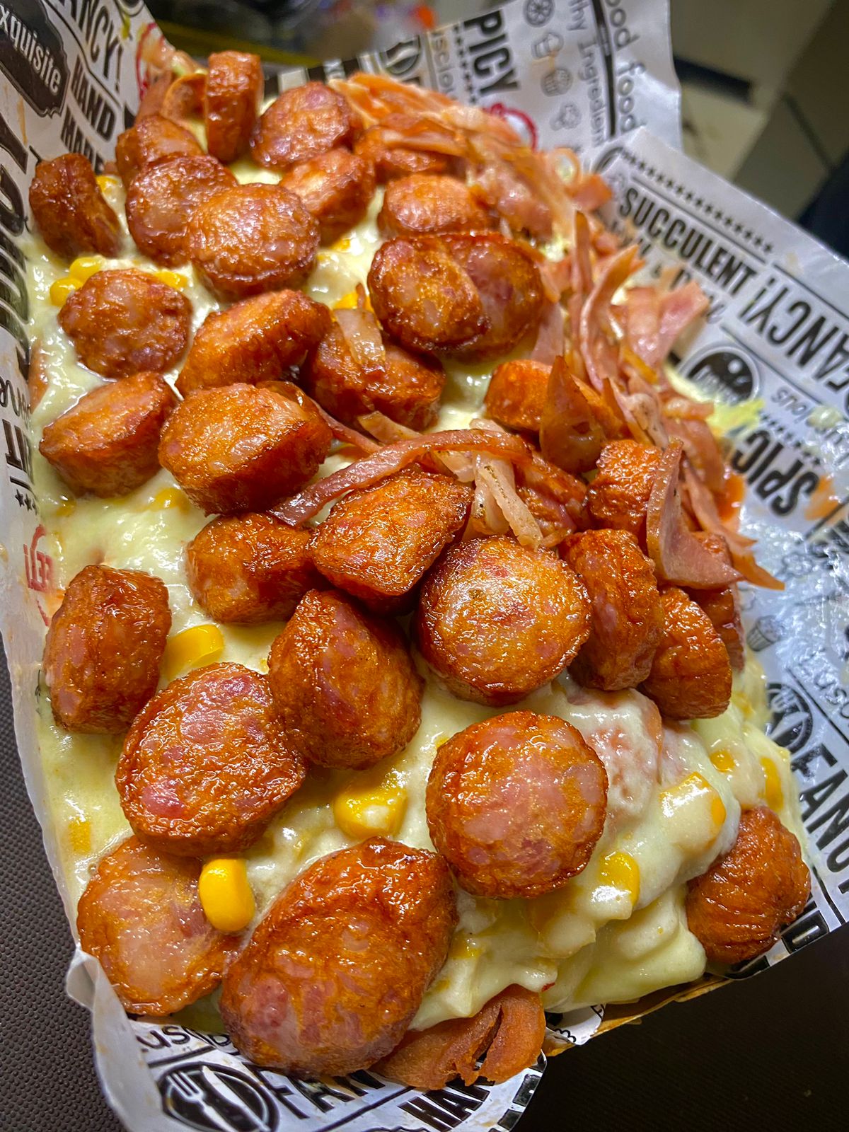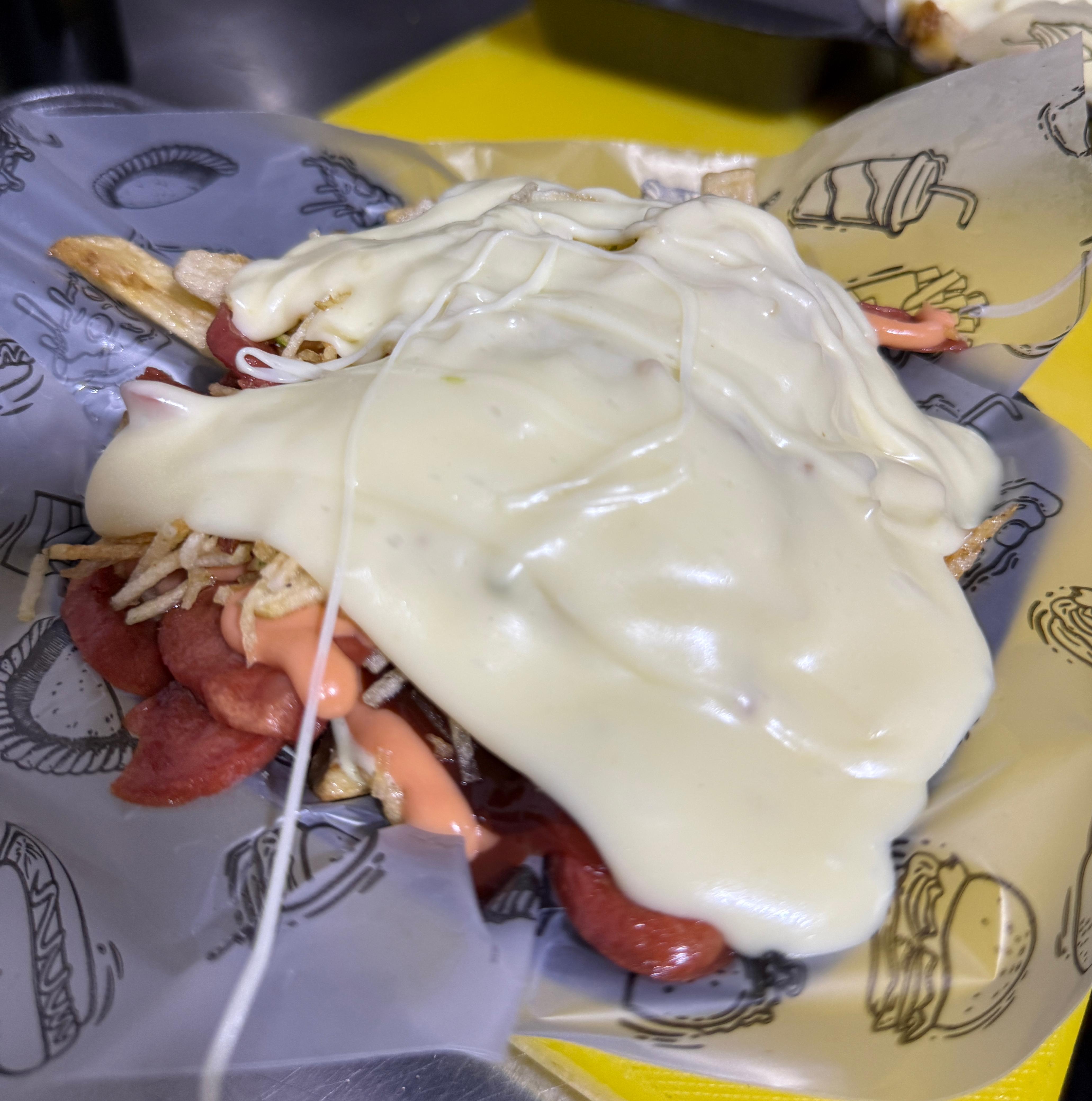 Papa criolla o francesa, salchicha, fusión de queso gratinado, ripio de papa y salsa de la casa. (Empaque en un porta comida J1)