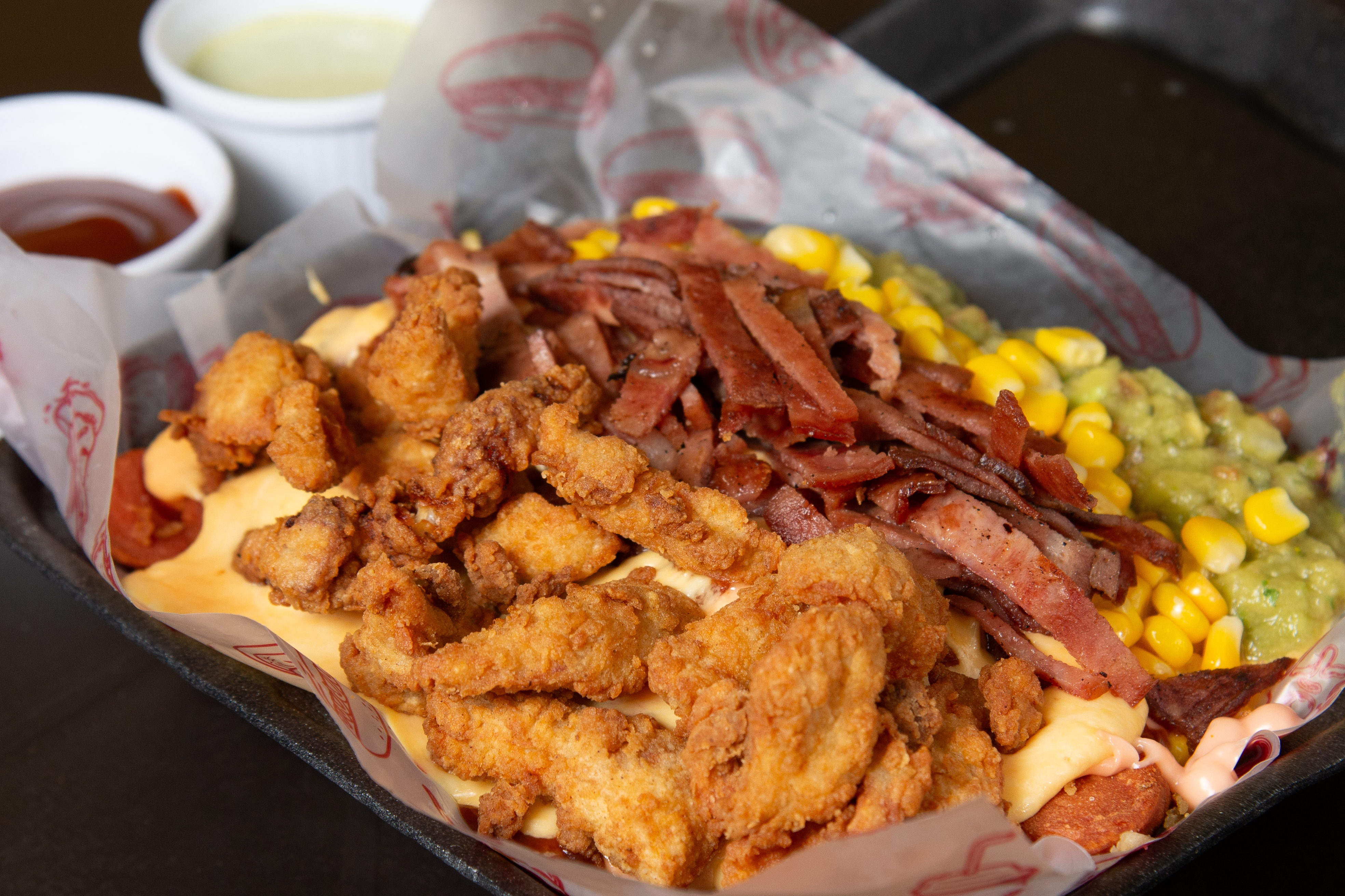 Papa criolla o francesa, salchicha, tocineta, pollo crocante, maicitos, guacamole, fusión de queso gratinado, ripio de papas y salsa de la casa.
