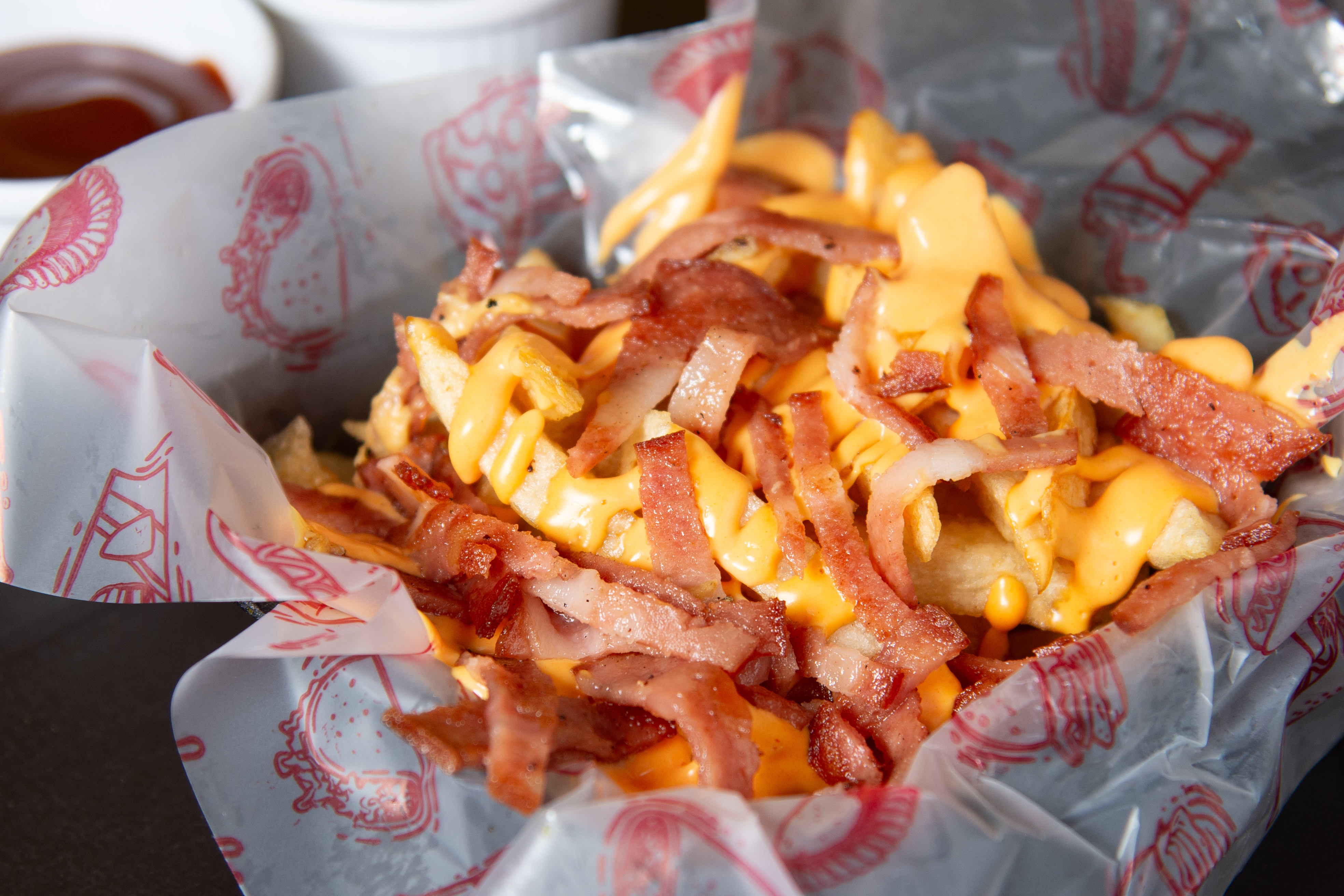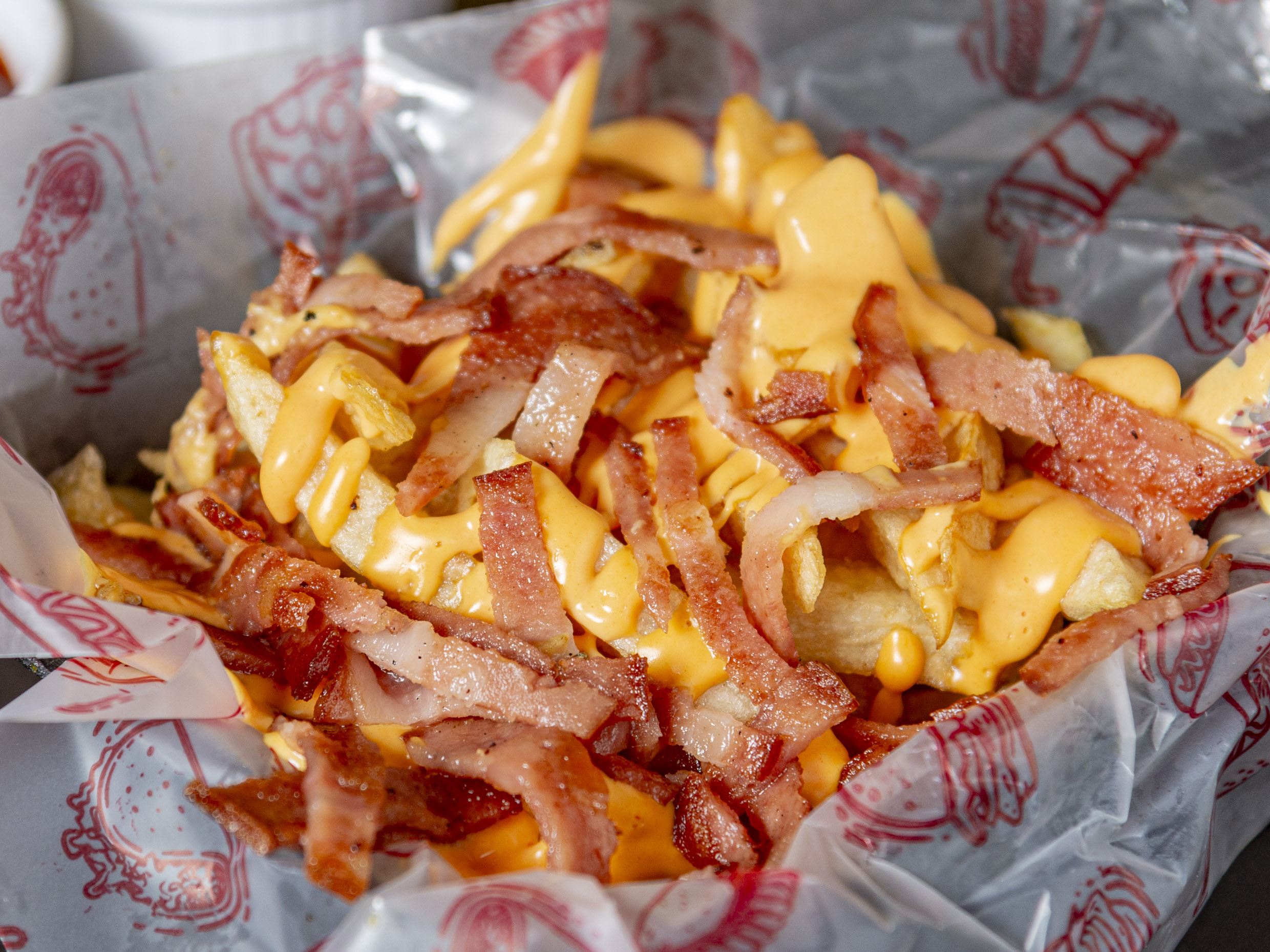 Papas a la francesa bañadas en queso cheddar y tocineta ahumada.